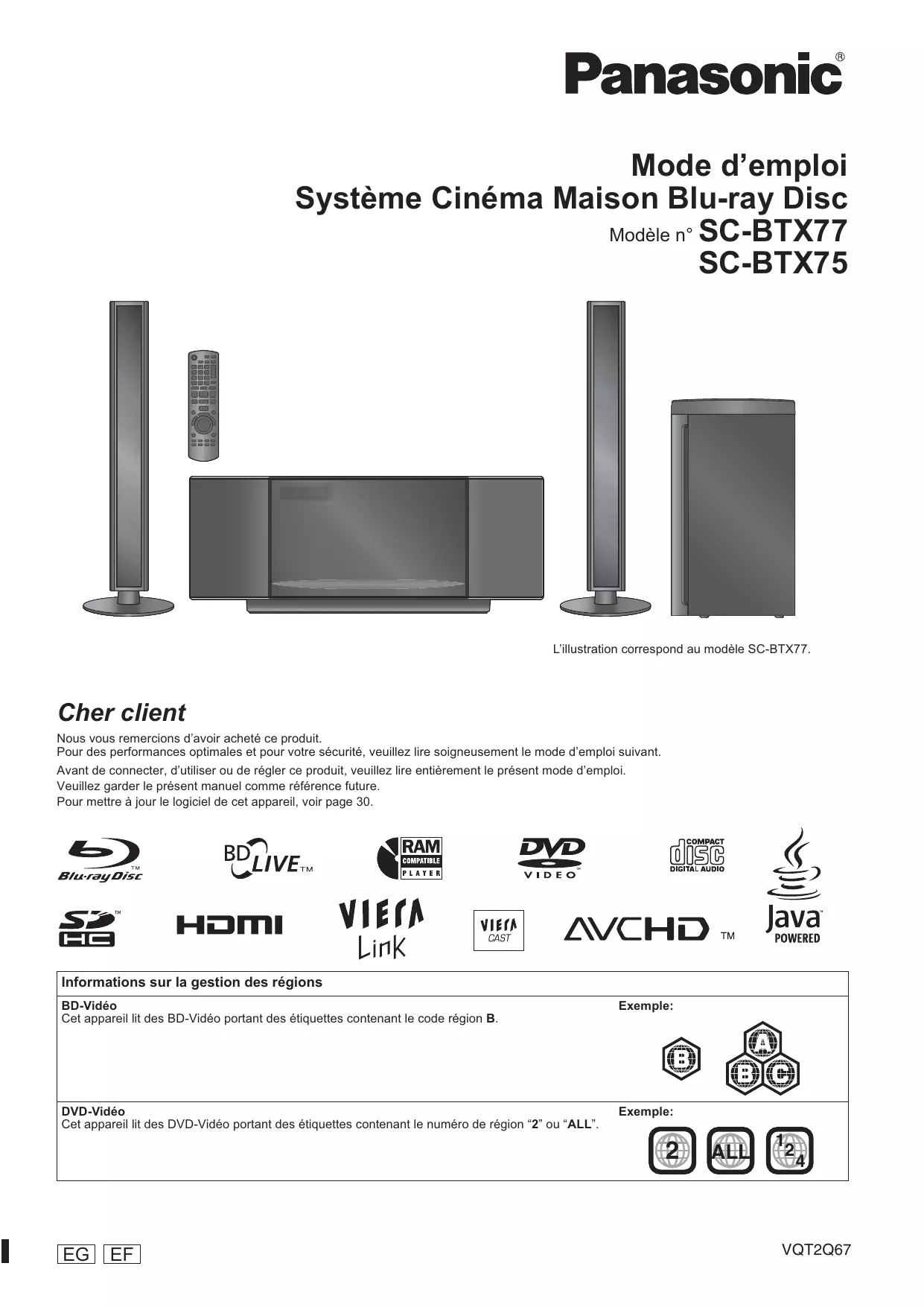Mode d’emploi Système Cinéma Maison Blu-ray Disc Modèle n° SC-BTX77 SC-BTX75 L’illustration correspond au modèle SC-BTX77. Cher client Nous vous remercions d’avoir acheté ce produit. Pour des performances optimales et pour votre sécurité, veuillez lire soigneusement le mode d’emploi suivant. Avant de connecter, d’utiliser ou de régler ce produit, veuillez lire entièrement le présent mode d’emploi. Veuillez garder le présent manuel comme référence future. Pour mettre à jour le logiciel de cet appareil, voir page 30. Informations sur la gestion des régions BD-Vidéo Cet appareil lit des BD-Vidéo portant des étiquettes contenant le code région B. Exemple: DVD-Vidéo Cet appareil lit des DVD-Vidéo portant des étiquettes contenant le numéro de région “2” ou “ALL”. Exemple: