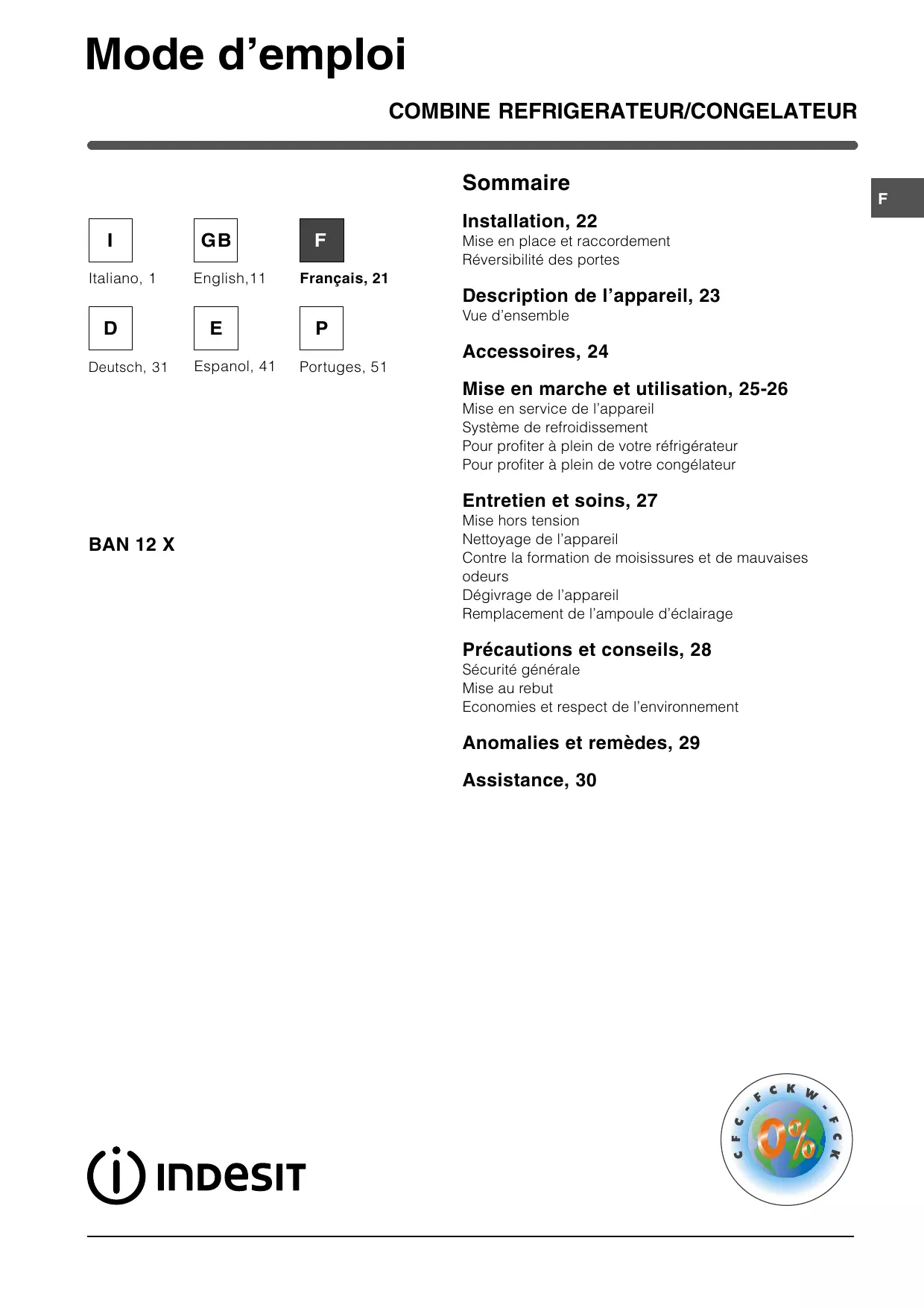 BAN 12 X - Réfrigérateur congélateur INDESIT - Notice d'utilisation et mode d'emploi gratuit
