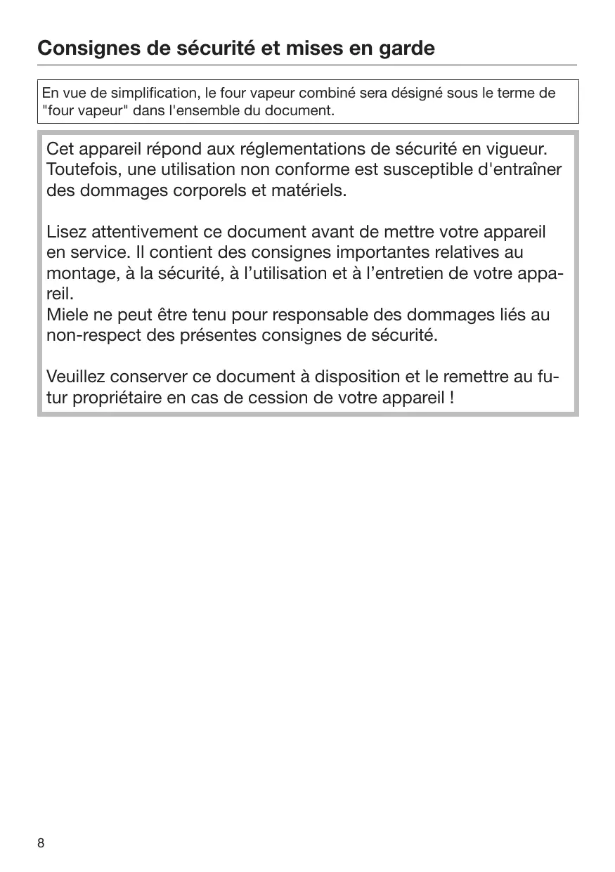 Consignes de sécurité et mises en garde En vue de simplification, le four vapeur combiné sera désigné sous le terme de "four vapeur" dans l'ensemble du document. Cet appareil répond aux réglementations de sécurité en vigueur. Toutefois, une utilisation non conforme est susceptible d'entraîner des dommages corporels et matériels. Lisez attentivement ce document avant de mettre votre appareil en service. Il contient des consignes importantes relatives au montage, à la sécurité, à l’utilisation et à l’entretien de votre appareil. Miele ne peut être tenu pour responsable des dommages liés au non-respect des présentes consignes de sécurité. Veuillez conserver ce document à disposition et le remettre au futur propriétaire en cas de cession de votre appareil !