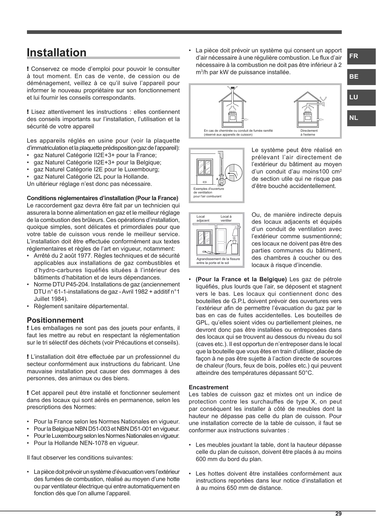 Installation ! Conservez ce mode d’emploi pour pouvoir le consulter à tout moment. En cas de vente, de cession ou de déménagement, veillez à ce qu’il suive l’appareil pour informer le nouveau propriétaire sur son fonctionnement et lui fournir les conseils correspondants. ! Lisez attentivement les instructions : elles contiennent des conseils importants sur l’installation, l’utilisation et la sécurité de votre appareil Les appareils réglés en usine pour (voir la plaquette d’immatriculation et la plaquette prédisposition gaz de l’appareil): • gaz Naturel Catégorie II2E+3+ pour la France; • gaz Naturel Catégorie II2E+3+ pour la Belgique; • gaz Naturel Catégorie I2E pour le Luxembourg; • gaz Naturel Catégorie I2L pour la Hollande. Un ultérieur réglage n’est donc pas nécessaire. Conditions réglementaires d’installation (Pour la France) Le raccordement gaz devra être fait par un technicien qui assurera la bonne alimentation en gaz et le meilleur réglage de la combustion des brûleurs. Ces opérations d’installation, quoique simples, sont délicates et primordiales pour que votre table de cuisson vous rende le meilleur service. L’installation doit être effectuée conformément aux textes réglementaires et règles de l’art en vigueur, notamment: • Arrêté du 2 août 1977. Règles techniques et de sécurité applicables aux installations de gaz combustibles et d’hydro-carbures liquéfiés situées à l’intérieur des bâtiments d’habitation et de leurs dépendances. • Norme DTU P45-204. Installations de gaz (anciennement DTU n° 61-1-installations de gaz - Avril 1982 + additif n°1 Juillet 1984). • Règlement sanitaire départemental.