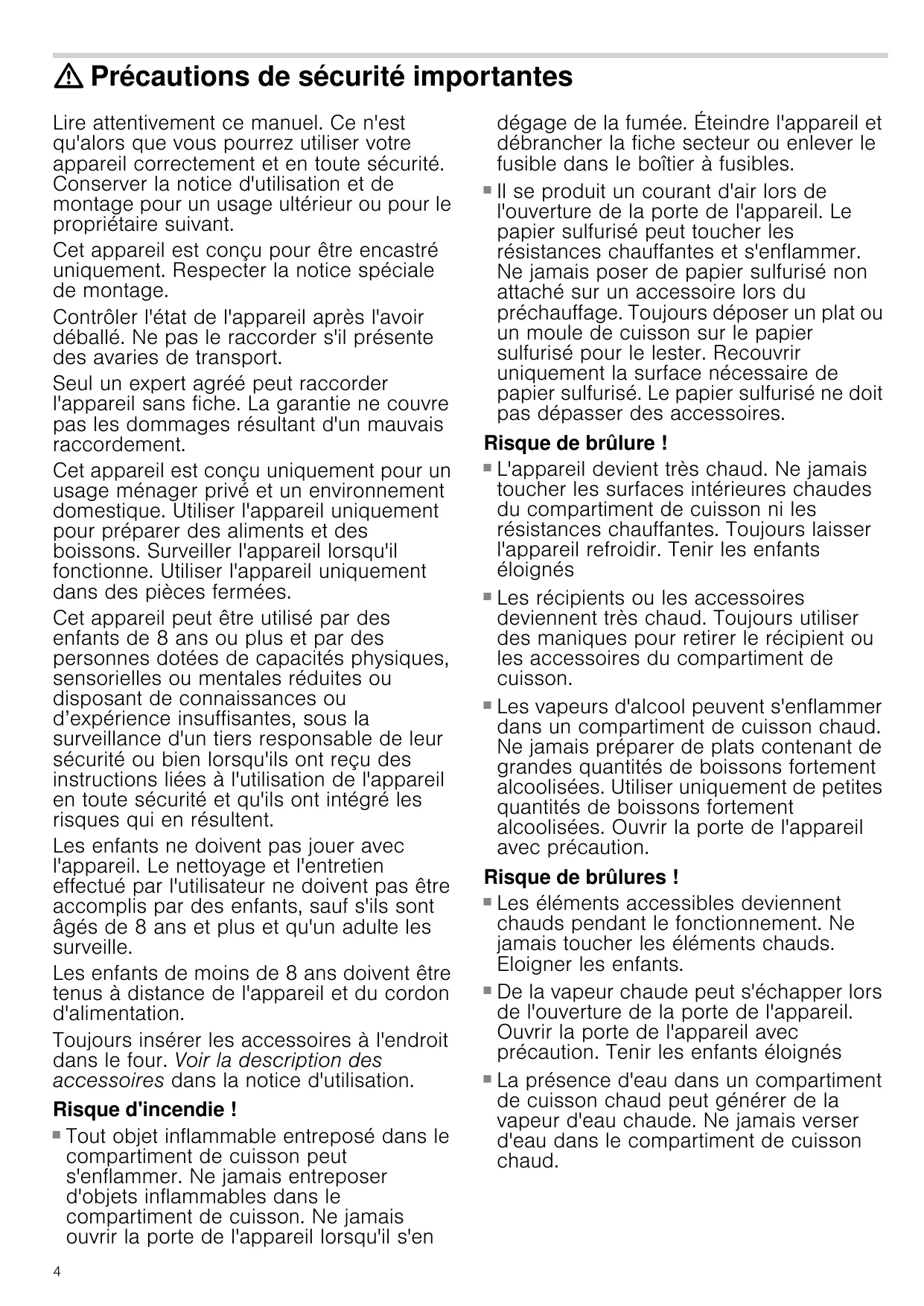 Contrôler l'état de l'appareil après l'avoir déballé. Ne pas le raccorder s'il présente des avaries de transport. Seul un expert agréé peut raccorder l'appareil sans fiche. La garantie ne couvre pas les dommages résultant d'un mauvais raccordement. Cet appareil est conçu uniquement pour un usage ménager privé et un environnement domestique. Utiliser l'appareil uniquement pour préparer des aliments et des boissons. Surveiller l'appareil lorsqu'il fonctionne. Utiliser l'appareil uniquement dans des pièces fermées. Cet appareil peut être utilisé par des enfants de 8 ans ou plus et par des personnes dotées de capacités physiques, sensorielles ou mentales réduites ou disposant de connaissances ou d’expérience insuffisantes, sous la surveillance d'un tiers responsable de leur sécurité ou bien lorsqu'ils ont reçu des instructions liées à l'utilisation de l'appareil en toute sécurité et qu'ils ont intégré les risques qui en résultent. Les enfants ne doivent pas jouer avec l'appareil. Le nettoyage et l'entretien effectué par l'utilisateur ne doivent pas être accomplis par des enfants, sauf s'ils sont âgés de 8 ans et plus et qu'un adulte les surveille. Les enfants de moins de 8 ans doivent être tenus à distance de l'appareil et du cordon d'alimentation. Toujours insérer les accessoires à l'endroit dans le four. Voir la description des accessoires dans la notice d'utilisation. Risque d'incendie ! ■ Tout objet inflammable entreposé dans le compartiment de cuisson peut s'enflammer. Ne jamais entreposer d'objets inflammables dans le compartiment de cuisson. Ne jamais ouvrir la porte de l'appareil lorsqu'il s'en 4