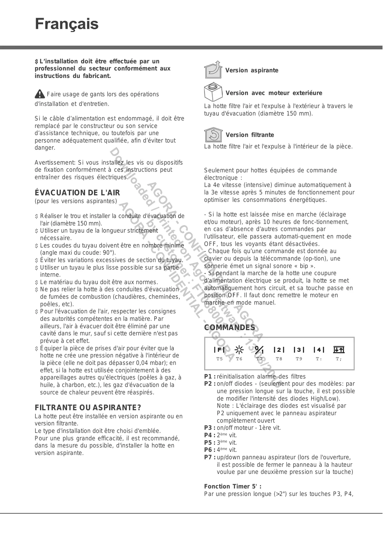 Seulement pour hottes équipées de commande électronique :