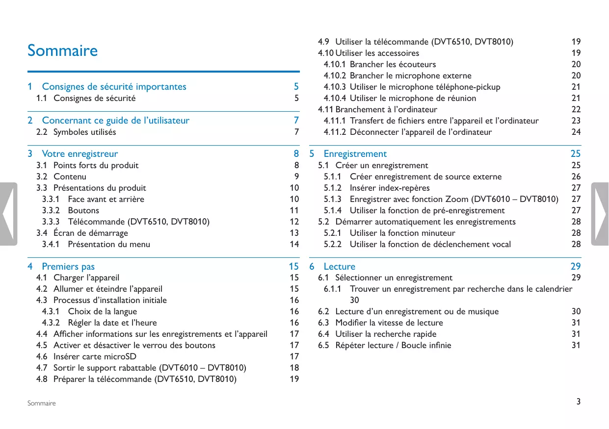 1 Consignes de sécurité importantes 5 1.1 Consignes de sécurité 5 2 Concernant ce guide de l'utilisateur 7 2.2 Symboles utilisés 7 3 Votre enregisture 8 3.1 Points forts du produit 8 3.2 Contenu 9 3.3 Présentations du produit 10 3.3.1 Face avant et arrêté 10 3.3.2 Boutons 11 3.3.3 Télécommande (DVT6510, DVT8010) 12 3.4 Ecran de démarrage 13 3.4.1 Présentation du menu 14 4 Premiers pas 15 4.1 Charger l'appareil 15 4.2 Allumer et éteindre l'appareil 15 4.3 Processus d'installation initiale 16 4.3.1 Choix de la langue 16 4.3.2 Régler la date et l'heure 16 4.4 Afficher informations sur les enregistrements et l'appareil 17 4.5 Activer et désactiver le verrou des boutons 17 4.6 Insérer carte microSD 17 4.7 Sortir le support rabattable (DVT6010 - DVT8010) 18 4.8 Préparer la télécommande (DVT6510, DVT8010) 19