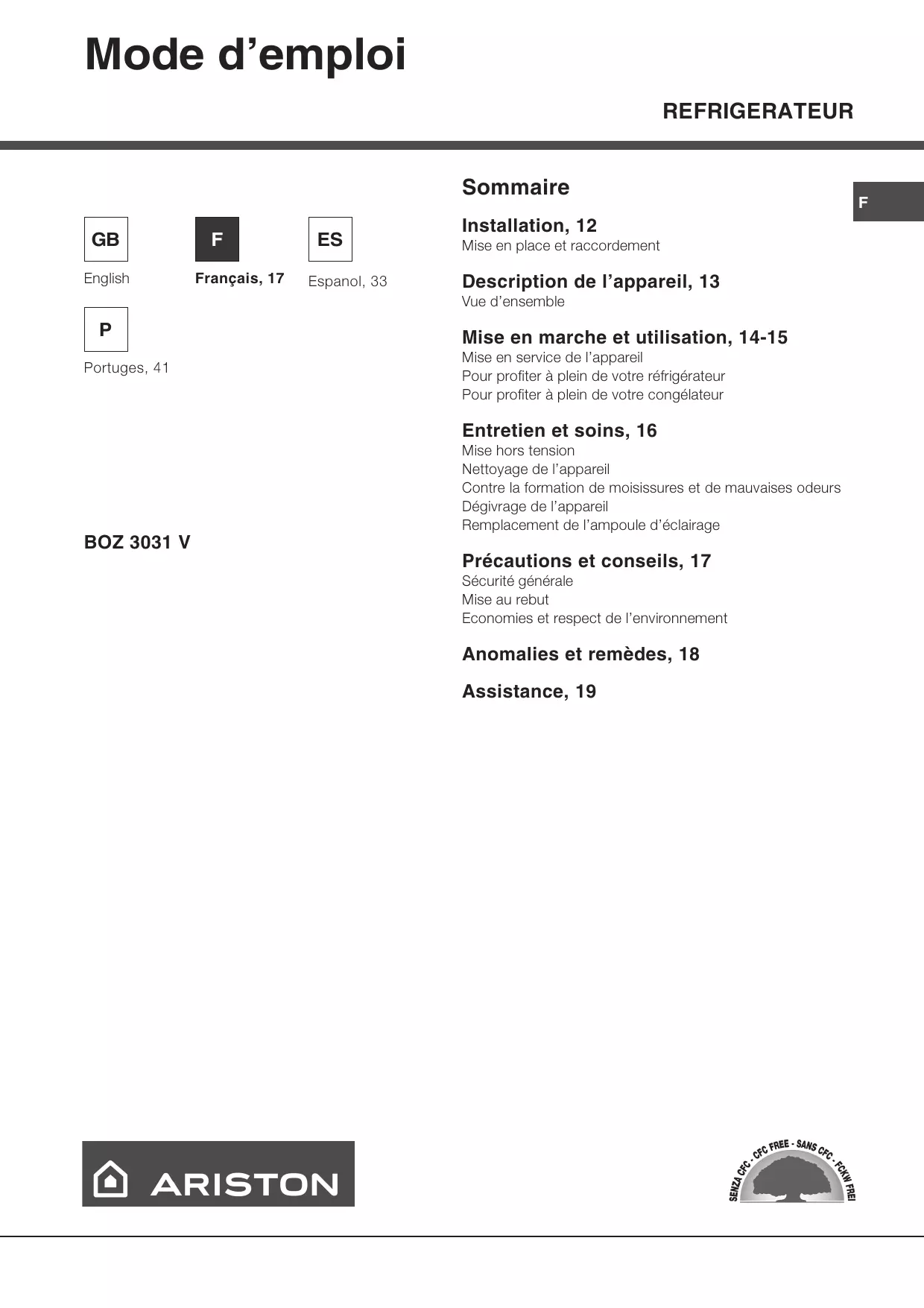 BOZ 3031V - Réfrigérateur ARISTON - Notice d'utilisation et mode d'emploi gratuit