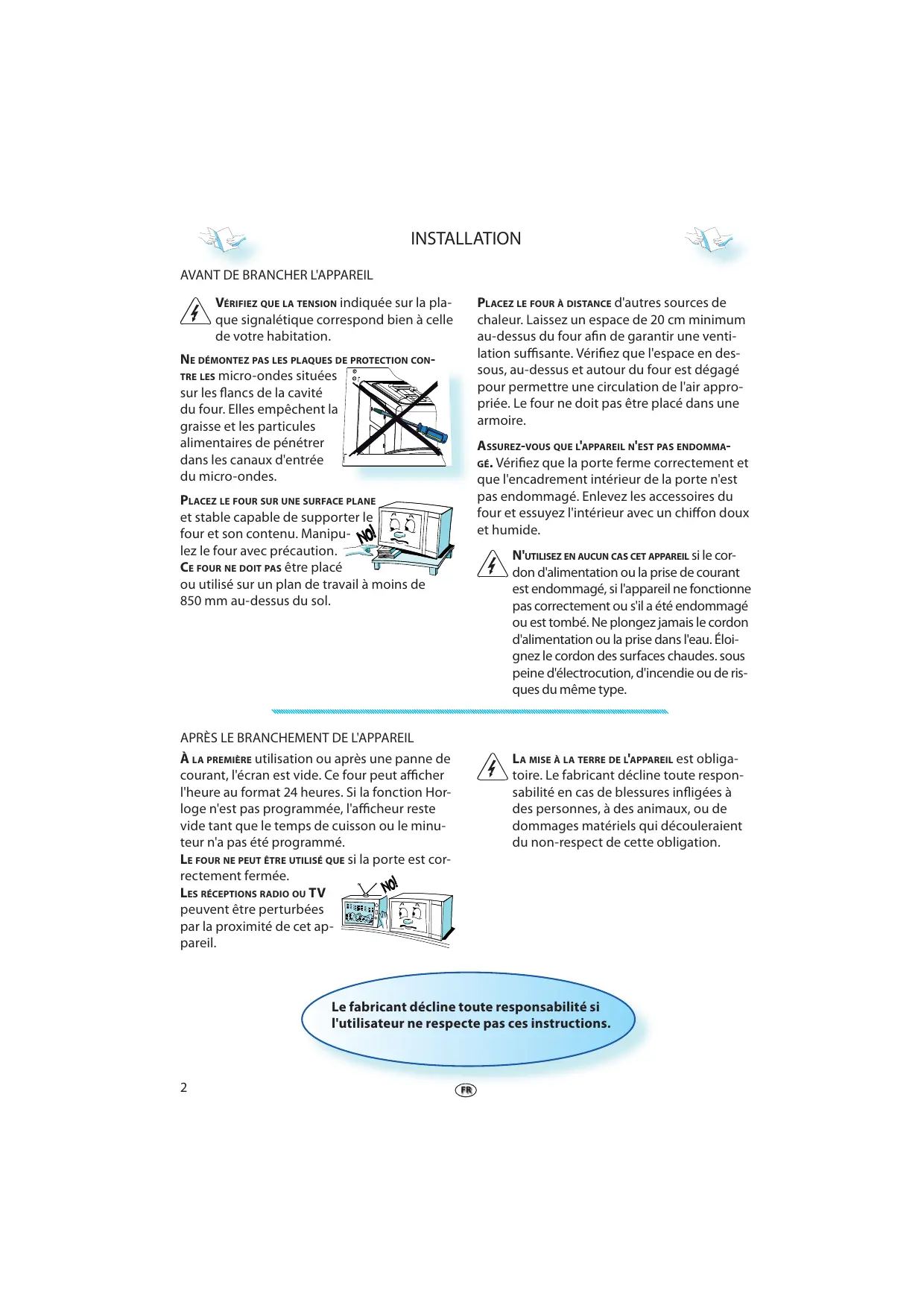peuvent être perturbées par la proximité de cet appareil. LA MISE À LA TERRE DE L'APPAREIL est obligatoire. Le fabricant décline toute responsabilité en cas de blessures infligées à des personnes, à des animaux, ou de dommages matériels qui découleraient du non-respect de cette obligation. Le fabricant décline toute responsabilité si l'utilisateur ne respecte pas ces instructions.