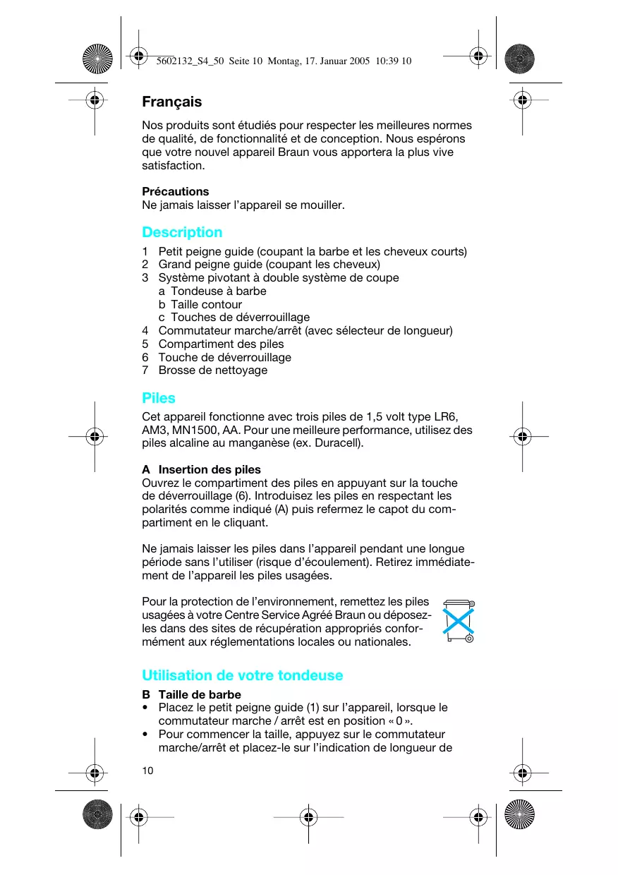 Piles Cet appareil fonctionne avec trois piles de 1,5 volt type LR6, AM3, MN1500, AA. Pour une meilleure performance, utilisez des piles alcaline au manganèse (ex. Duracell). A Insertion des piles Ouvrez le compartiment des piles en appuyant sur la touche de déverrouillage (6). Introduisez les piles en respectant les polarités comme indiqué (A) puis refermez le capot du compartiment en le cliquant. Ne jamais laisser les piles dans l’appareil pendant une longue période sans l’utiliser (risque d’écoulement). Retirez immédiatement de l’appareil les piles usagées. Pour la protection de l’environnement, remettez les piles usagées à votre Centre Service Agréé Braun ou déposezles dans des sites de récupération appropriés conformément aux réglementations locales ou nationales.