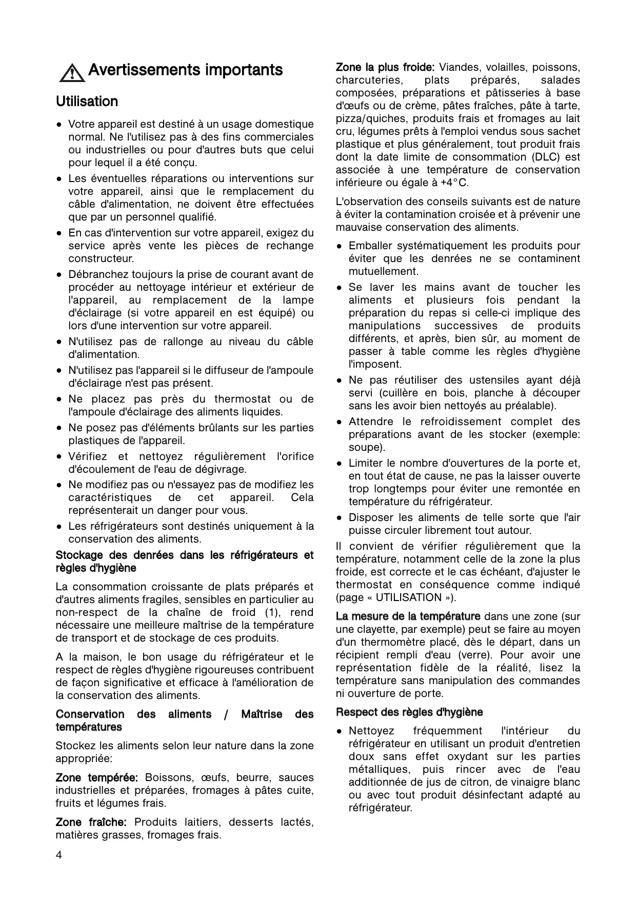 Zone la plus froide: Viandes, volailles, poissons, charcuteries, plats préparés, salades composées, préparations et pâtisseries à base d'ufs ou de crème, pâtes fraîches, pâte à tarte, pizza/quiches, produits frais et fromages au lait cru, légumes prêts à l'emploi vendus sous sachet plastique et plus généralement, tout produit frais dont la date limite de consommation (DLC) est associée à une température de conservation inférieure ou égale à +4°C. L'observation des conseils suivants est de nature à éviter la contamination croisée et à prévenir une mauvaise conservation des aliments. Emballer systématiquement les produits pour éviter que les denrées ne se contaminent mutuellement. Se laver les mains avant de toucher les aliments et plusieurs fois pendant la préparation du repas si celle-ci implique des manipulations successives de produits différents, et après, bien sûr, au moment de passer à table comme les règles d'hygiène l'imposent. Ne pas réutiliser des ustensiles ayant déjà servi (cuillère en bois, planche à découper sans les avoir bien nettoyés au préalable). Attendre le refroidissement complet des préparations avant de les stocker (exemple: soupe). Limiter le nombre d'ouvertures de la porte et, en tout état de cause, ne pas la laisser ouverte trop longtemps pour éviter une remontée en température du réfrigérateur. Disposer les aliments de telle sorte que l'air puisse circuler librement tout autour. Il convient de vérifier régulièrement que la température, notamment celle de la zone la plus froide, est correcte et le cas échéant, d'ajuster le thermostat en conséquence comme indiqué (page « UTILISATION »). La mesure de la température dans une zone (sur une clayette, par exemple) peut se faire au moyen d'un thermomètre placé, dès le départ, dans un récipient rempli d'eau (verre). Pour avoir une représentation fidèle de la réalité, lisez la température sans manipulation des commandes ni ouverture de porte. Respect des règles d'hygiène Nettoyez fréquemment l'intérieur du réfrigérateur en utilisant un produit d'entretien doux sans effet oxydant sur les parties métalliques, puis rincer avec de l'eau additionnée de jus de citron, de vinaigre blanc ou avec tout produit désinfectant adapté au réfrigérateur.