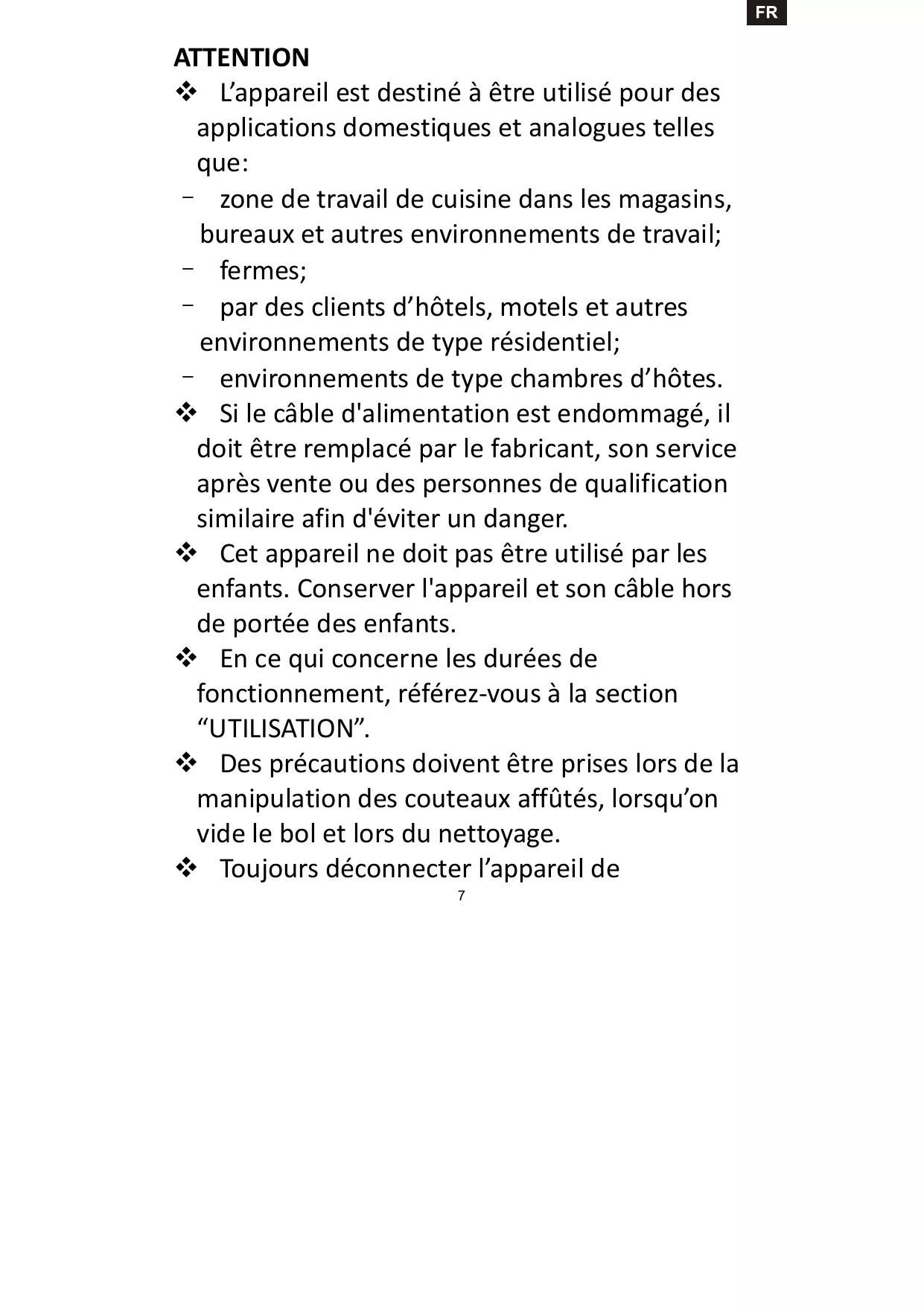 ATTENTION L’appareil est destiné à être utilisé pour des applications domestiques et analogues telles que: – zone de travail de cuisine dans les magasins, bureaux et autres environnements de travail; – fermes; – par des clients d’hôtels, motels et autres environnements de type résidentiel; – environnements de type chambres d’hôtes. Si le câble d'alimentation est endommagé, il doit être remplacé par le fabricant, son service après vente ou des personnes de qualification similaire afin d'éviter un danger. Cet appareil ne doit pas être utilisé par les enfants. Conserver l'appareil et son câble hors de portée des enfants. En ce qui concerne les durées de fonctionnement, référez-vous à la section “UTILISATION”. Des précautions doivent être prises lors de la manipulation des couteaux affûtés, lorsqu’on vide le bol et lors du nettoyage. Toujours déconnecter l’appareil de