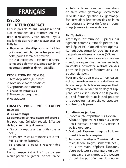 FRANÇAIS ISYLISS EPILATEUR COMPACT Depuis près de 25 ans, BaByliss répond aux aspirations des femmes en matière d’épilation. Votre nouvel Isyliss est le fruit des recherches avancées de BaByliss.