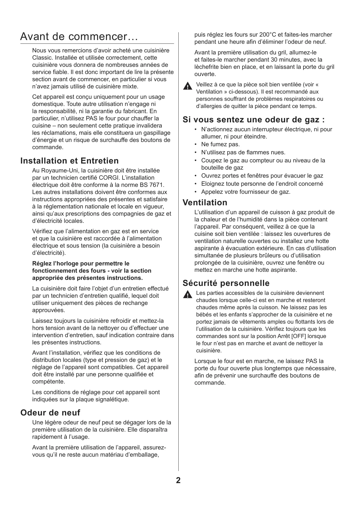 Nous vous remercions d'avoir acheté une cuisinière Classic. Installée et utilisée correctement, cette cuisinière vous donna de nombreuses années de service fiable. Il est donc important de dire la presente section avant de commencer, en particulier si vous n'avez jamais utilisé de cuisinière mixte.
