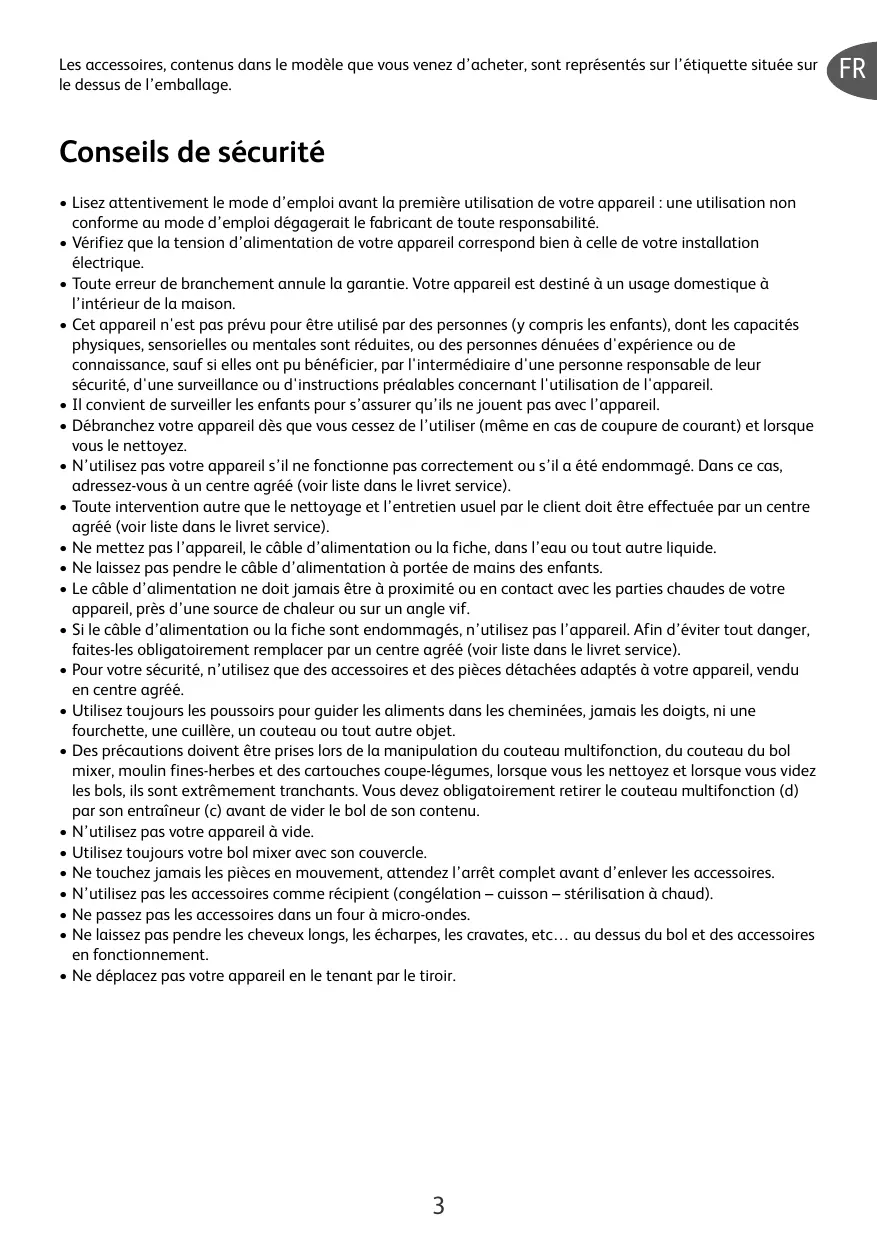 • Lisez attentivement le mode d’emploi avant la première utilisation de votre appareil : une utilisation non conforme au mode d’emploi dégagerait le fabricant de toute responsabilité. • Vérifiez que la tension d’alimentation de votre appareil correspond bien à celle de votre installation électrique. • Toute erreur de branchement annule la garantie. Votre appareil est destiné à un usage domestique à l’intérieur de la maison. • Cet appareil n'est pas prévu pour être utilisé par des personnes (y compris les enfants), dont les capacités physiques, sensorielles ou mentales sont réduites, ou des personnes dénuées d'expérience ou de connaissance, sauf si elles ont pu bénéficier, par l'intermédiaire d'une personne responsable de leur sécurité, d'une surveillance ou d'instructions préalables concernant l'utilisation de l'appareil. • Il convient de surveiller les enfants pour s’assurer qu’ils ne jouent pas avec l’appareil. • Débranchez votre appareil dès que vous cessez de l’utiliser (même en cas de coupure de courant) et lorsque vous le nettoyez. • N’utilisez pas votre appareil s’il ne fonctionne pas correctement ou s’il a été endommagé. Dans ce cas, adressez-vous à un centre agréé (voir liste dans le livret service). • Toute intervention autre que le nettoyage et l’entretien usuel par le client doit être effectuée par un centre agréé (voir liste dans le livret service). • Ne mettez pas l’appareil, le câble d’alimentation ou la fiche, dans l’eau ou tout autre liquide. • Ne laissez pas pendre le câble d’alimentation à portée de mains des enfants. • Le câble d’alimentation ne doit jamais être à proximité ou en contact avec les parties chaudes de votre appareil, près d’une source de chaleur ou sur un angle vif. • Si le câble d’alimentation ou la fiche sont endommagés, n’utilisez pas l’appareil. Afin d’éviter tout danger, faites-les obligatoirement remplacer par un centre agréé (voir liste dans le livret service). • Pour votre sécurité, n’utilisez que des accessoires et des pièces détachées adaptés à votre appareil, vendu en centre agréé. • Utilisez toujours les poussoirs pour guider les aliments dans les cheminées, jamais les doigts, ni une fourchette, une cuillère, un couteau ou tout autre objet. • Des précautions doivent être prises lors de la manipulation du couteau multifonction, du couteau du bol mixer, moulin fines-herbes et des cartouches coupe-légumes, lorsque vous les nettoyez et lorsque vous videz les bols, ils sont extrêmement tranchants. Vous devez obligatoirement retirer le couteau multifonction (d) par son entraîneur (c) avant de vider le bol de son contenu. • N’utilisez pas votre appareil à vide. • Utilisez toujours votre bol mixer avec son couvercle. • Ne touchez jamais les pièces en mouvement, attendez l’arrêt complet avant d’enlever les accessoires. • N’utilisez pas les accessoires comme récipient (congélation – cuisson – stérilisation à chaud). • Ne passez pas les accessoires dans un four à micro-ondes. • Ne laissez pas pendre les cheveux longs, les écharpes, les cravates, etc… au dessus du bol et des accessoires en fonctionnement. • Ne déplacez pas votre appareil en le tenant par le tiroir.