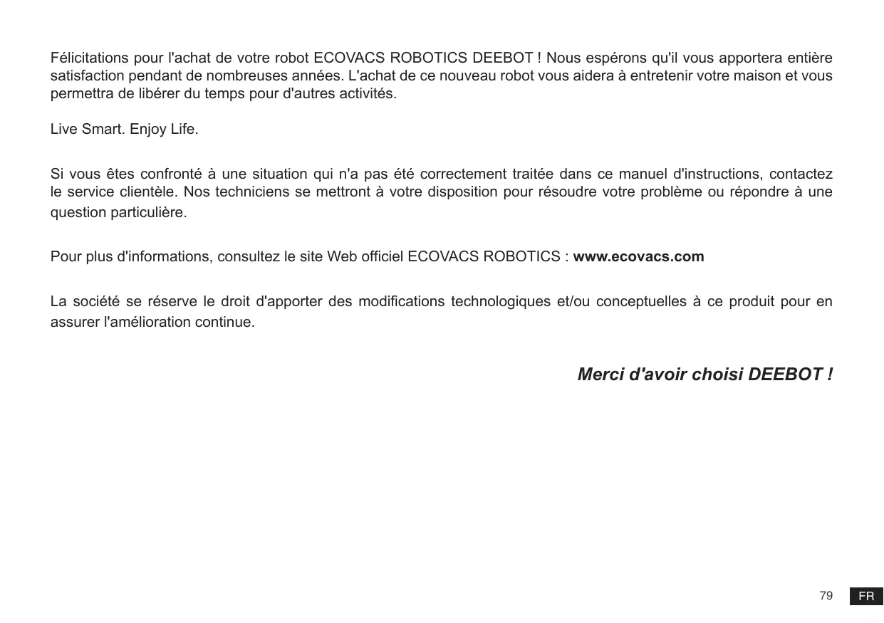 Félicitations pour l'achat de votre robot ECOVACS ROBOTICS DEEBOT ! Nous espérons qu'il vous apportera entière satisfaction pendant de nombreuses années. L'achat de ce nouveau robot vous aidera à entretenir votre maison et vous permettra de libérer du temps pour d'autres activités. Live Smart. Enjoy Life. Si vous êtes confronté à une situation qui n'a pas été correctement traitée dans ce manuel d'instructions, contactez le service clientèle. Nos techniciens se mettront à votre disposition pour résoudre votre problème ou répondre à une question particulière. Pour plus d'informations, consultez le site Web officiel ECOVACS ROBOTICS : www.ecovacs.com La société se réserve le droit d'apporter des modifications technologiques et/ou conceptuelles à ce produit pour en assurer l'amélioration continue.