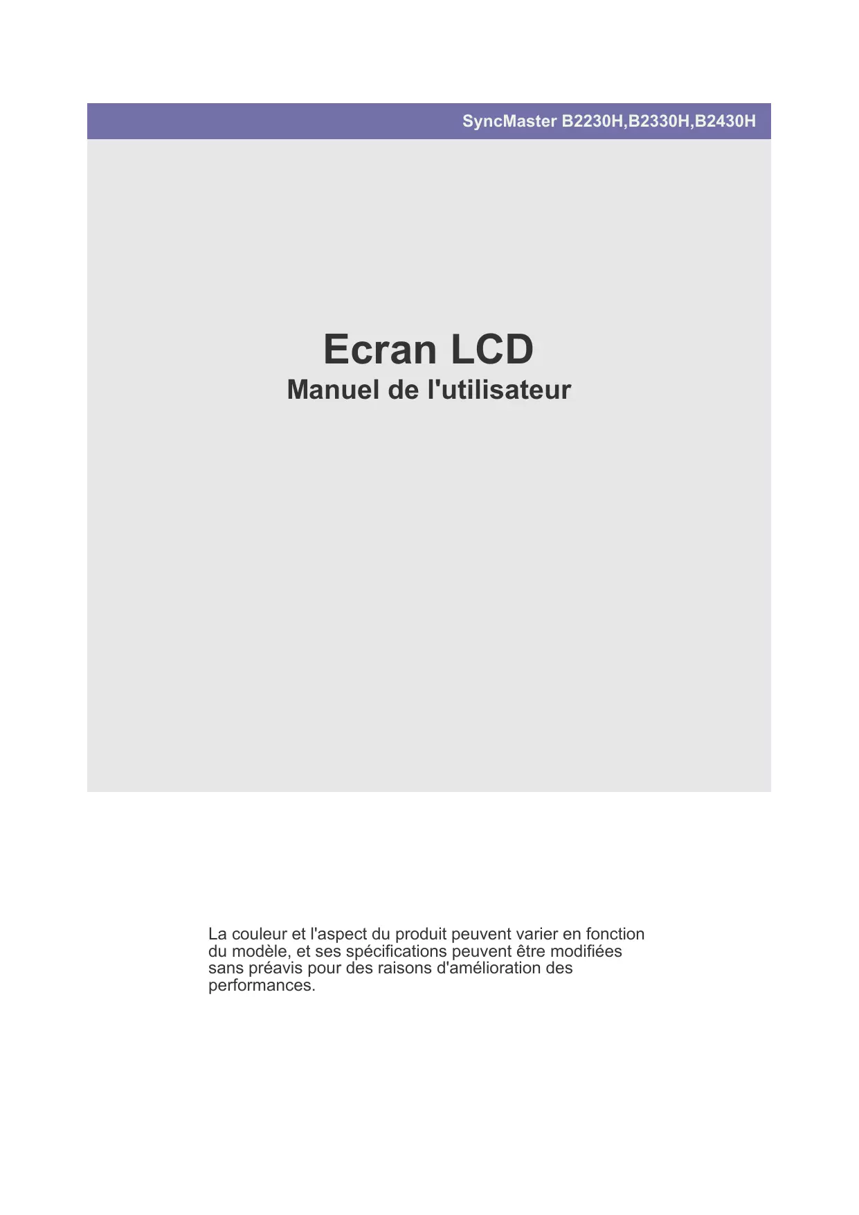 SyncMaster B2230H,B2330H,B2430H Ecran LCD Manuel de l'utilisateur La couleur et l'aspect du produit peuvent varier en fonction du modèle, et ses spécifications peuvent être modifiées sans préavis pour des raisons d'amélioration des performances. Table des matières