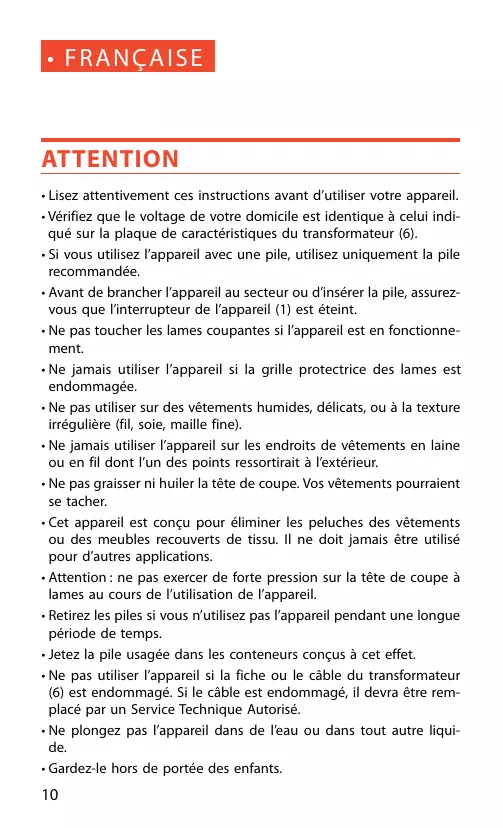 - Cet appareil est conçu pour éliminer les peluches des vêtements ou des meubles recouverts de tissu. Il ne doit jamais être utilisé pour d’autres applications.