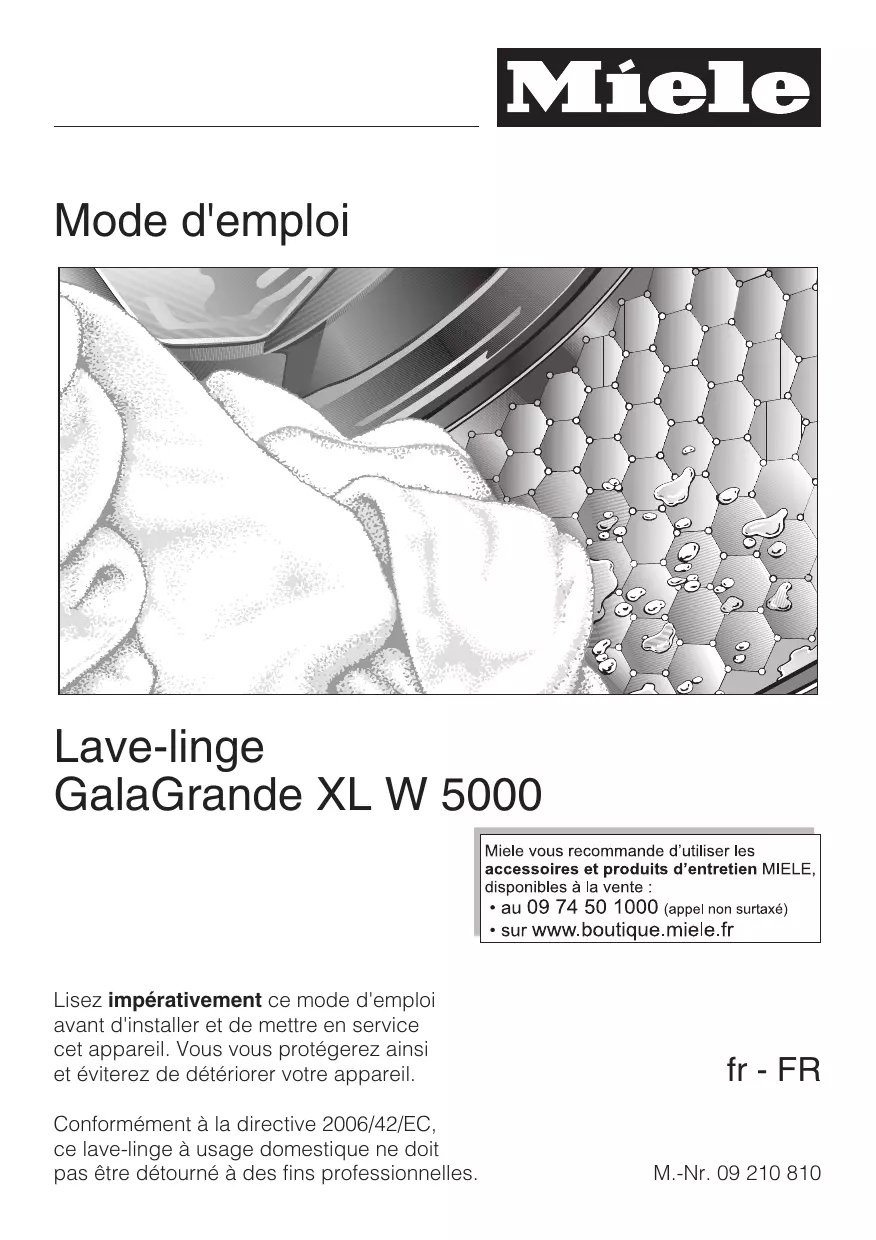 Mode d'emploi Lave-linge GalaGrande XL W 5000 Lisez impérativement ce mode d'emploi avant d'installer et de mettre en service cet appareil. Vous vous protégerez ainsi et éviterez de détériorer votre appareil. Conformément à la directive 2006/42/EC, ce lave-linge à usage domestique ne doit pas être détourné à des fins professionnelles. fr - FR M.-Nr. 09 210 810 Votre contribution à la protection de l'environnement Elimination de l'emballage L'emballage protège les lave-linge des avaries de transport. Les matériaux utilisés sont choisis en fonction de critères écologiques, de façon à en faciliter le recyclage. Le recyclage de l'emballage économise les matières premières et réduit le volume des déchets à éliminer. En principe, le revendeur reprend l'emballage à sa mise en service. Enlèvement de l'ancien appareil Les anciens appareils électriques et électroniques contiennent souvent encore des matériaux recyclables. Ils contiennent également des matériaux nocifs, nécessaires au bon fonctionnement et à la sécurité de l'appareil. Ces matériaux peuvent être dangereux pour les hommes et l'environnement s'ils restent dans la collecte de déchets ou s'ils sont mal manipulés. Ne jetez par conséquent en aucun cas votre appareil avec les déchets. Faites appel au service d'enlèvement mis en place par votre commune ou rapportez votre appareil dans un point de collecte spécialement adapté à l'évacuation de ce type d'appareils. Gardez l'ancien appareil hors de portée des enfants jusqu'à son enlèvement, pour éviter tout accident.