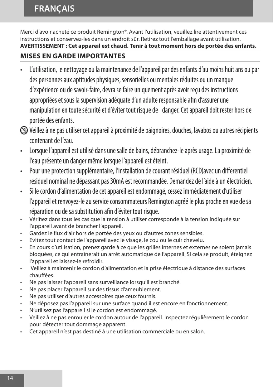 Merci d'avoir acheté ce produit Remington. Avant l'utilisation, veuillez dire attentivement ces instructions et conservez-les dans un endroit sur. Retirez tout l'emballage avant utilisation. AVERTISSEMENT : Cet apparéil est chaud. Tenir à tout moment hors de portée des enfants.