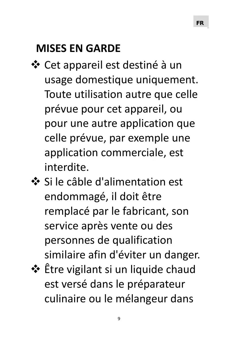 Cet appareil est destiné à un usage domestique uniquement. Toute utilisation autre que celle prévue pour cet appareil, ou pour une autre application que celle prévue, par exemple une application commerciale, est interdite. Si le câble d'alimentation est endommagé, il doit être remplacé par le fabricant, son service après vente ou des personnes de qualification similaire afin d'éviter un danger. Être vigilant si un liquide chaud est versé dans le préparateur culinaire ou le mélangeur dans