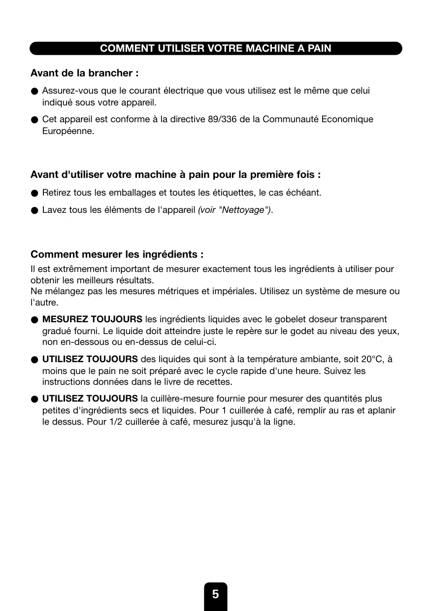 Avant de la brancher : ● Assurez-vous que le courant électrique que vous utilisez est le même que celui indiqué sous votre appareil. ● Cet appareil est conforme à la directive 89/336 de la Communauté Economique Européenne. Avant d'utiliser votre machine à pain pour la première fois : ● Retirez tous les emballages et toutes les étiquettes, le cas échéant. ● Lavez tous les éléments de l'appareil (voir "Nettoyage"). Comment mesurer les ingrédients : Il est extrêmement important de mesurer exactement tous les ingrédients à utiliser pour obtenir les meilleurs résultats. Ne mélangez pas les mesures métriques et impériales. Utilisez un système de mesure ou l'autre. ● MESUREZ TOUJOURS les ingrédients liquides avec le gobelet doseur transparent gradué fourni. Le liquide doit atteindre juste le repère sur le godet au niveau des yeux, non en-dessous ou en-dessus de celui-ci. ● UTILISEZ TOUJOURS des liquides qui sont à la température ambiante, soit 20°C, à moins que le pain ne soit préparé avec le cycle rapide d'une heure. Suivez les instructions données dans le livre de recettes. ● UTILISEZ TOUJOURS la cuillère-mesure fournie pour mesurer des quantités plus petites d'ingrédients secs et liquides. Pour 1 cuillerée à café, remplir au ras et aplanir le dessus. Pour 1/2 cuillerée à café, mesurez jusqu'à la ligne.