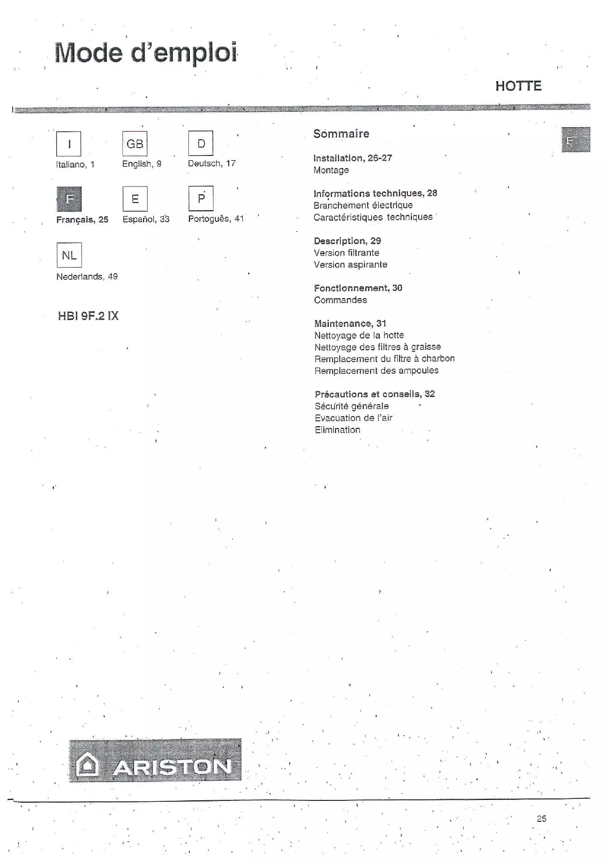 HBI 9 F.2IX - Hotte aspirante ARISTON - Notice d'utilisation et mode d'emploi gratuit