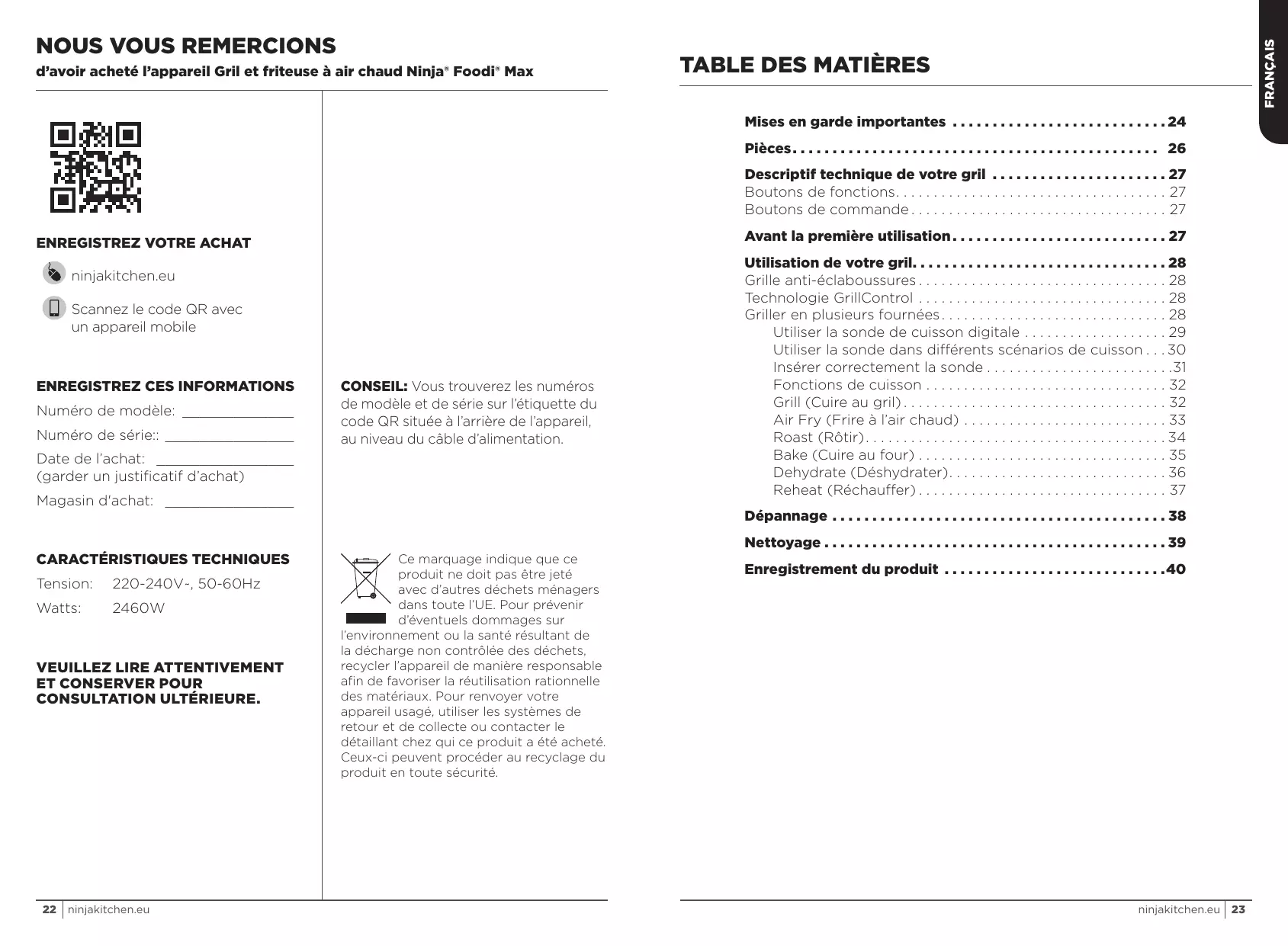 1 Retirez tous les matériaux d’emballage, les étiquettes et le ruban adhésif de l’appareil. 2 Retirez tous les accessoires de l’emballage et lisez attentivement ce manuel. Veuillez prêter une attention toute particulière aux instructions de fonctionnement, aux avertissements et aux mises en garde importantes afin d’éviter tout risque de blessure ou de dommage matériel. 3 Lavez la plaque à griller, la grille anti-éclaboussures, le bac à cuisson, la brosse et la cuve de cuisson dans de l’eau tiède savonneuse, puis rincez et séchez soigneusement. Tous les accessoires, à l’exception de la sonde, peuvent aller au lave-vaisselle. Ne lavez JAMAIS l’unité principale ou la sonde au lave-vaisselle. ninjakitchen.eu