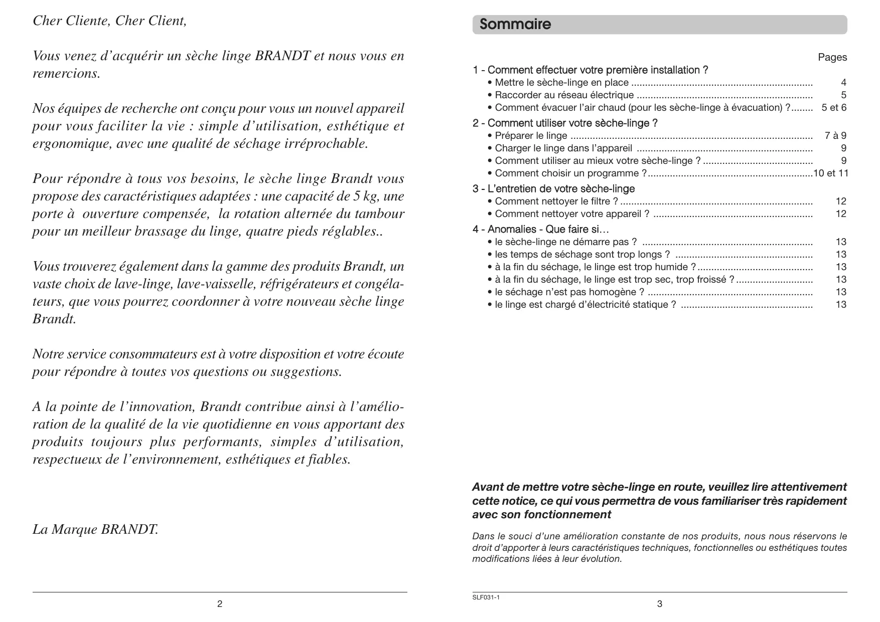 Cher Cliente, Cher Client, Sommaire Vous venez d’acquérir un sèche linge BRANDT et nous vous en remercions. Nos équipes de recherche ont conçu pour vous un nouvel appareil pour vous faciliter la vie : simple d’utilisation, esthétique et ergonomique, avec une qualité de séchage irréprochable. Pour répondre à tous vos besoins, le sèche linge Brandt vous propose des caractéristiques adaptées : une capacité de 5 kg, une porte à ouverture compensée, la rotation alternée du tambour pour un meilleur brassage du linge, quatre pieds réglables.. Vous trouverez également dans la gamme des produits Brandt, un vaste choix de lave-linge, lave-vaisselle, réfrigérateurs et congélateurs, que vous pourrez coordonner à votre nouveau sèche linge Brandt. Pages