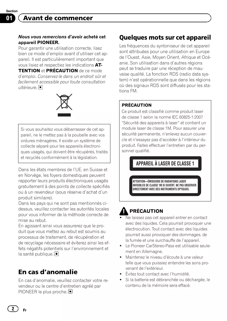 INVISIBLES DE CLASSE 1M SI OUVERT. NE PAS OBSERVER DIRECTEMENT AVEC DES INSTRUMENTS OPTIQUES. PRÉCAUTION ! Ne laissez pas cet appareil entrer en contact avec des liquides. Cela pourrait provoquer une électrocution. Tout contact avec des liquides pourrait aussi provoquer des dommages, de la fumée et une surchauffe de l’appareil. ! Le Pioneer CarStereo-Pass est utilisable seulement en Allemagne. ! Maintenez le niveau d’écoute à une valeur telle que vous puissiez entendre les sons provenant de l’extérieur. ! Évitez tout contact avec l’humidité. ! Si la batterie est débranchée ou déchargée, le contenu de la mémoire sera effacé. Section Avant de commencer
