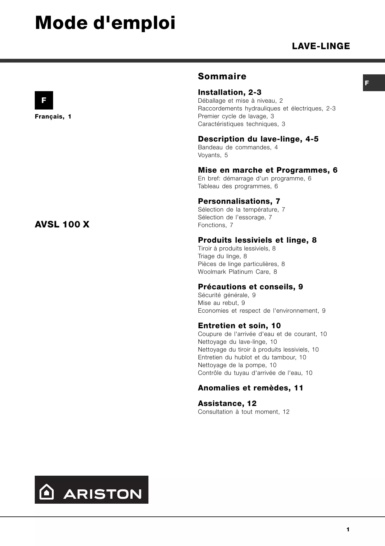 Installation, 2-3 Déballage et mise à niveau, 2 Raccordements hydrauliques et électriques, 2-3 Premier cycle de lavage, 3 Caractéristiques techniques, 3 Description du lave-linge, 4-5 Bandeau de commandes, 4 Voyants, 5 Mise en marche et Programmes, 6 En bref: démarrage d'un programme, 6 Tableau des programmes, 6 Personnalisations, 7 AVSL 100 X Sélection de la température, 7 Sélection de l'essorage, 7 Fonctions, 7 Produits lessiviels et linge, 8 Tiroir à produits lessiviels, 8 Triage du linge, 8 Pièces de linge particulières, 8 Woolmark Platinum Care, 8 Précautions et conseils, 9 Sécurité générale, 9 Mise au rebut, 9 Economies et respect de l'environnement, 9 Entretien et soin, 10 Coupure de l'arrivée d'eau et de courant, 10 Nettoyage du lave-linge, 10 Nettoyage du tiroir à produits lessiviels, 10 Entretien du hublot et du tambour, 10 Nettoyage de la pompe, 10 Contrôle du tuyau d'arrivée de l'eau, 10 Anomalies et remèdes, 11 Assistance, 12 Consultation à tout moment, 12