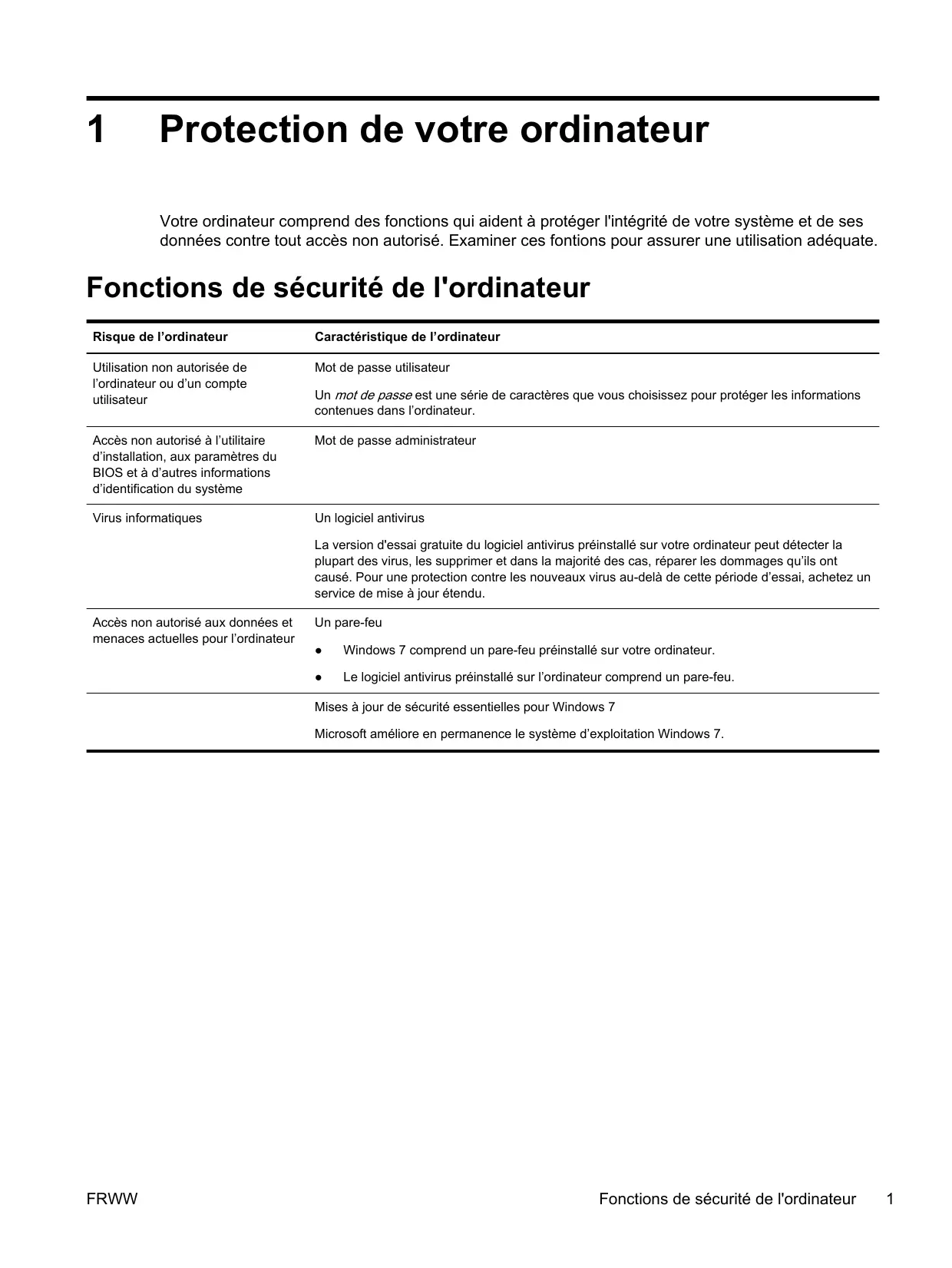 Le logiciel antivirus préinstallé sur l’ordinateur comprend un pare-feu. Mises à jour de sécurité essentielles pour Windows 7 Microsoft améliore en permanence le système d’exploitation Windows 7. FRWW Fonctions de sécurité de l'ordinateur