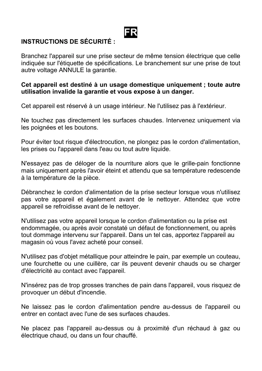 FR INSTRUCTIONS DE SÉCURITÉ : Branchez l'appareil sur une prise secteur de même tension électrique que celle indiquée sur l'étiquette de spécifications. Le branchement sur une prise de tout autre voltage ANNULE la garantie. Cet appareil est destiné à un usage domestique uniquement ; toute autre utilisation invalide la garantie et vous expose à un danger. Cet appareil est réservé à un usage intérieur. Ne l'utilisez pas à l'extérieur. Ne touchez pas directement les surfaces chaudes. Intervenez uniquement via les poignées et les boutons. Pour éviter tout risque d'électrocution, ne plongez pas le cordon d'alimentation, les prises ou l'appareil dans l'eau ou tout autre liquide. N'essayez pas de déloger de la nourriture alors que le grille-pain fonctionne mais uniquement après l'avoir éteint et attendu que sa température redescende à la température de la pièce. Débranchez le cordon d'alimentation de la prise secteur lorsque vous n'utilisez pas votre appareil et également avant de le nettoyer. Attendez que votre appareil se refroidisse avant de le nettoyer. N'utilisez pas votre appareil lorsque le cordon d'alimentation ou la prise est endommagée, ou après avoir constaté un défaut de fonctionnement, ou après tout dommage intervenu sur l'appareil. Dans un tel cas, apportez l'appareil au magasin où vous l'avez acheté pour conseil. N'utilisez pas d'objet métallique pour atteindre le pain, par exemple un couteau, une fourchette ou une cuillère, car ils peuvent devenir chauds ou se charger d'électricité au contact avec l'appareil. N'insérez pas de trop grosses tranches de pain dans l'appareil, vous risquez de provoquer un début d'incendie. Ne laissez pas le cordon d'alimentation pendre au-dessus de l'appareil ou entrer en contact avec l'une de ses surfaces chaudes. Ne placez pas l'appareil au-dessus ou à proximité d'un réchaud à gaz ou électrique chaud, ou dans un four chauffé.