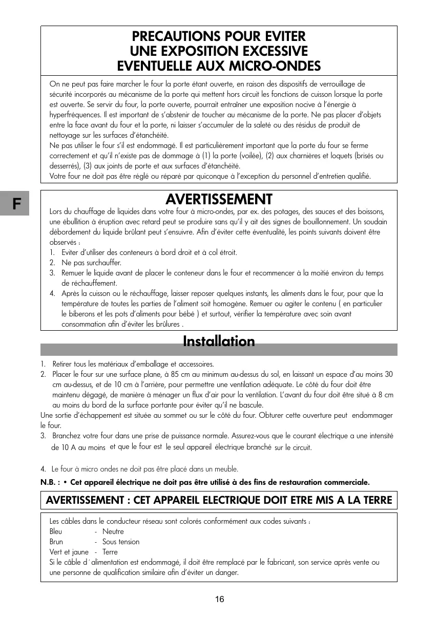 - Compte-tenu de ce que nous nous efforçons continuellement d’améliorer nos produits, nous pouvons modifier les spécifications sans préavis. NOTE IMPORTANTE A la différence des autres appareils de cuisson, votre four à micro-ondes ne chauffe pas le récipient mais uniquement son contenu. Un réel danger de brûlure de la gorge et du palais existe, si vous ne contrôlez pas la température des aliments avant de les absorber. Nous vous recommandons plus particulièrement de vérifier la température du lait (ou autre liquide), contenu dans un récipient (biberon par exemple) à donner aux nourrissons et enfants. Ne jamais faire chauffer de liquide dans un récipient fermé. (risque d’éclatement du récipient, avant, pendant ou oprès l’ouverture de la parte) Le remplacement du cable d’alimentation et/ou toute intervention nécessitant l’ouverture de l’appareil ne doit s’effectuer que par du personnel technique qualifié. Ce four micro-ondes est livre avec un cordon reseau special, qui, s’il est endommage, doit etre remplace par un cordon de meme type. Ce cordon ne peut etre delivre que par le fabriquant et installe par une personne competente. <French> Élimination de votre ancien appareil