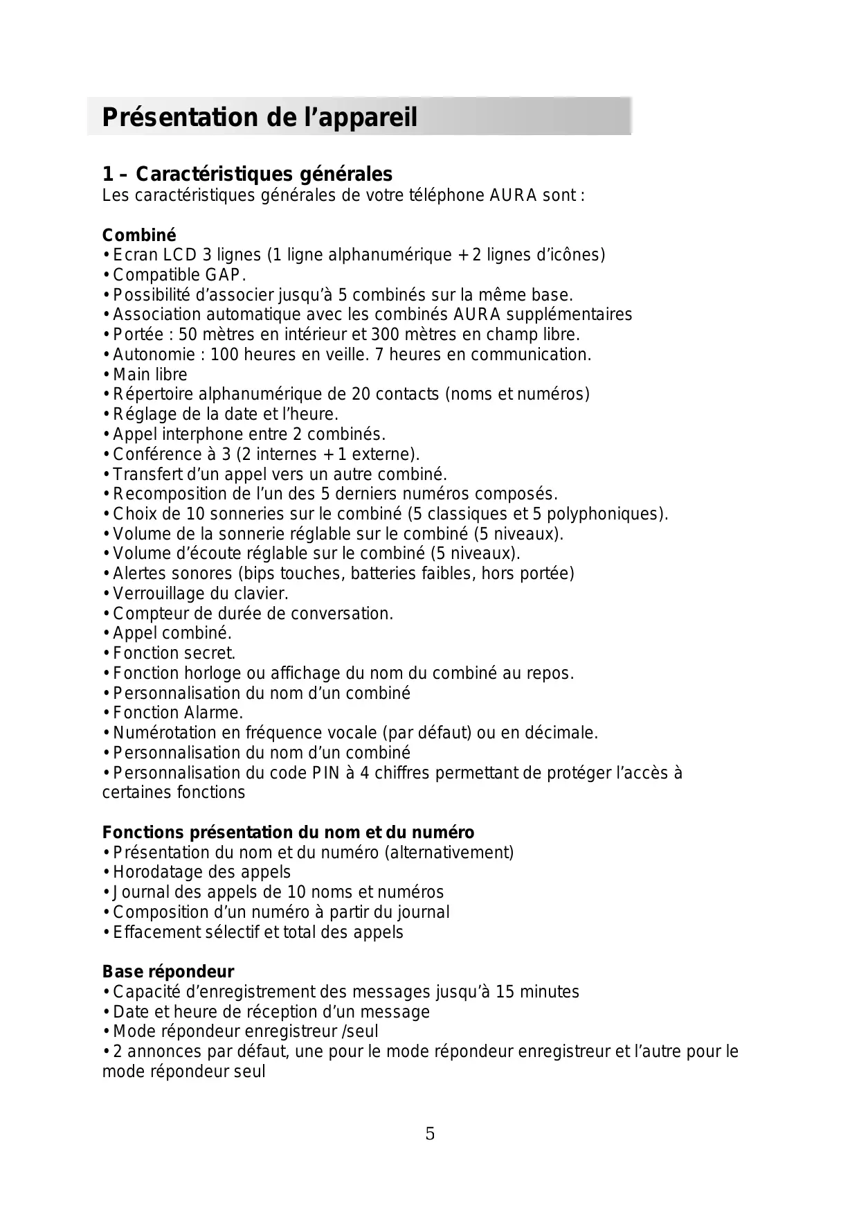 Présentation de l’appareil 1 – Caractéristiques générales Les caractéristiques générales de votre téléphone AURA sont : Combiné