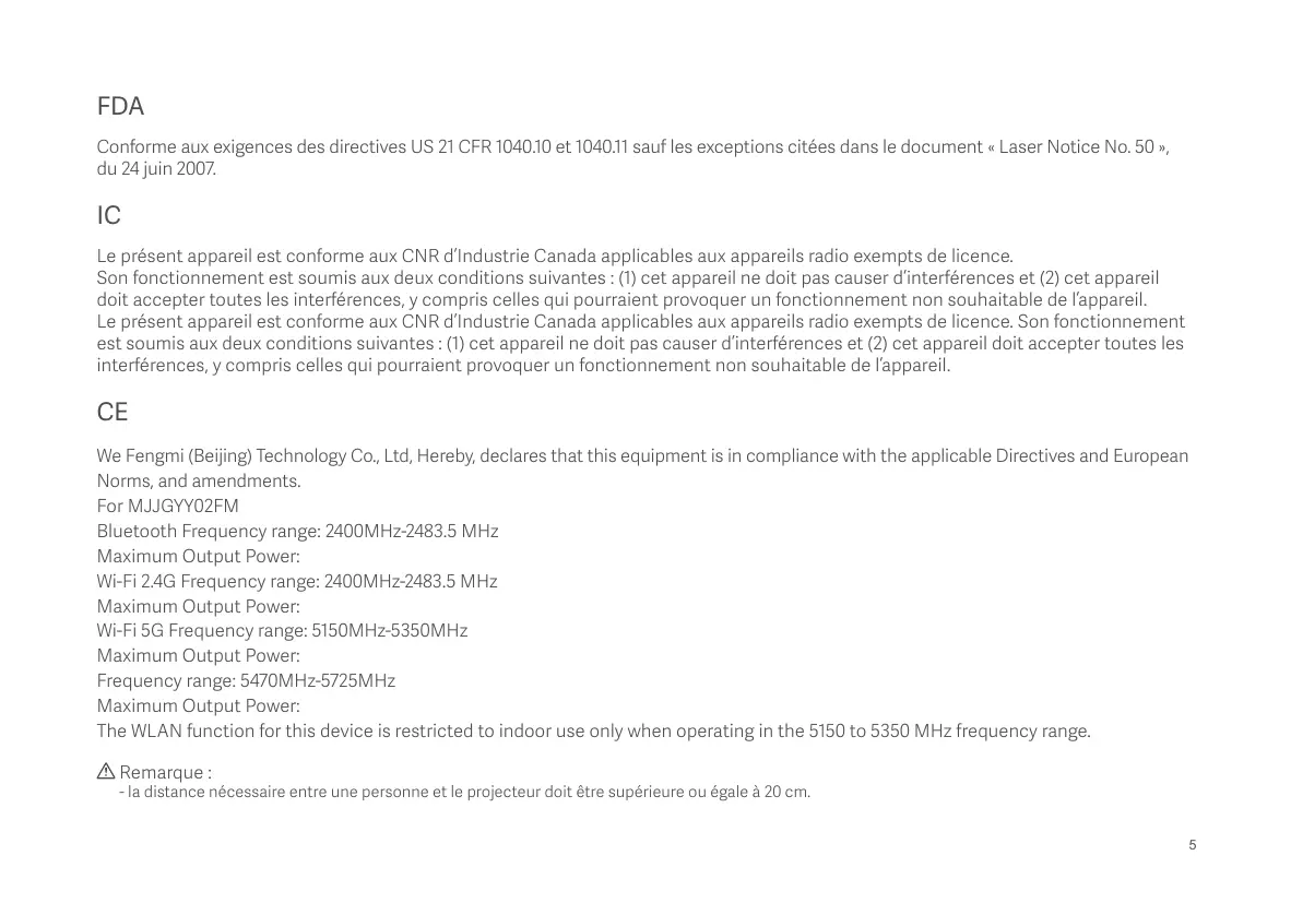 Télécommande Bluetooth Protection oculaire contre les lasers Télécommande Bluetooth Mi Alimentation électrique intégrée CA-CC, CC-CC intégré Voyant Lumière blanche intermittente Niveau de bruit Consommation d’énergie Alimentation électrique Consommation d’énergie en mode veille Régulation intelligente de la température Capteur de température Design processeur central remplaçable Température de stockage Température de fonctionnement Humidité de fonctionnement <32 dB@ mode standard/température ambiante 25°C/distance 1 m <250 W(max)@ mode dynamique 100 à 240 V 50/60 Hz Capteur de mouvement (possibilité de fermeture) <0,5 W Réglage automatique de la luminosité, réglage intelligent de la vitesse de ventilation Arrêt automatique en cas de surchauffe Mise à niveau du matériel via le service clientèle -20°C~55°C 0°C~40°C 20%~80% FAQ Questions L’écran ne s’affiche pas Le système Android plante Il y a une erreur d’affichage de l’écran La télécommande est manquante ou non synchronisée Le système s’éteint automatiquement après un avertissement de surchauffe Comment restaurer les paramètres d’usine ? Comment régler la mise au point ? Comment éviter les déformations en haut de l’image ? Comment utiliser le système de correction du trapèze ? Comment améliorer la capacité de saisie vocale de la télécommande Bluetooth afin qu’elle me comprenne ? Solutions Éteignez la source d’alimentation et débranchez le cordon d’alimentation. Rebranchez le cordon d’alimentation et redémarrez l’appareil. Éteignez la source d’alimentation et débranchez le cordon d’alimentation. Rebranchez le cordon d’alimentation et redémarrez l’appareil. Éteignez la source d’alimentation et débranchez le cordon d’alimentation. Rebranchez le cordon d’alimentation et redémarrez l’appareil. Éteignez la source d’alimentation et débranchez le cordon d’alimentation. Attendez cinq minutes avant de rebrancher le cordon d’alimentation, et le système redémarrera automatiquement. Une fois que le système a redémarré, synchronisez de nouveau la télécommande. Vérifiez que rien n’obstrue les orifices de ventilation du système pour vous assurer que le processus de refroidissement s’effectue normalement. Redémarrez l’appareil selon la méthode indiquée ci-dessus. Allez sur l’écran de configuration et sélectionnez Restaurer dans les Paramètres généraux. Choisissez si vous voulez conserver les applications installées et effectuez la réinitialisation. Allez dans Paramètres > Paramètre image, puis chercher Mise au point électrique. Appuyez sur les flèches droite et gauche de la télécommande pour régler la mise au point. Relâchez-les lorsque l’image à l’écran ou projetée au mur est nette. Le plus grand angle de la lentille se projette en haut de l’écran. Ainsi, toute irrégularité dans cette zone peut entraîner une déformation surdimensionnée de la projection. Nous avons estimé qu’une irrégularité d’environ 1 mm sur l’écran ou le mur entraîne une déformation de 3 mm. Un rideau de projection est recommandé.