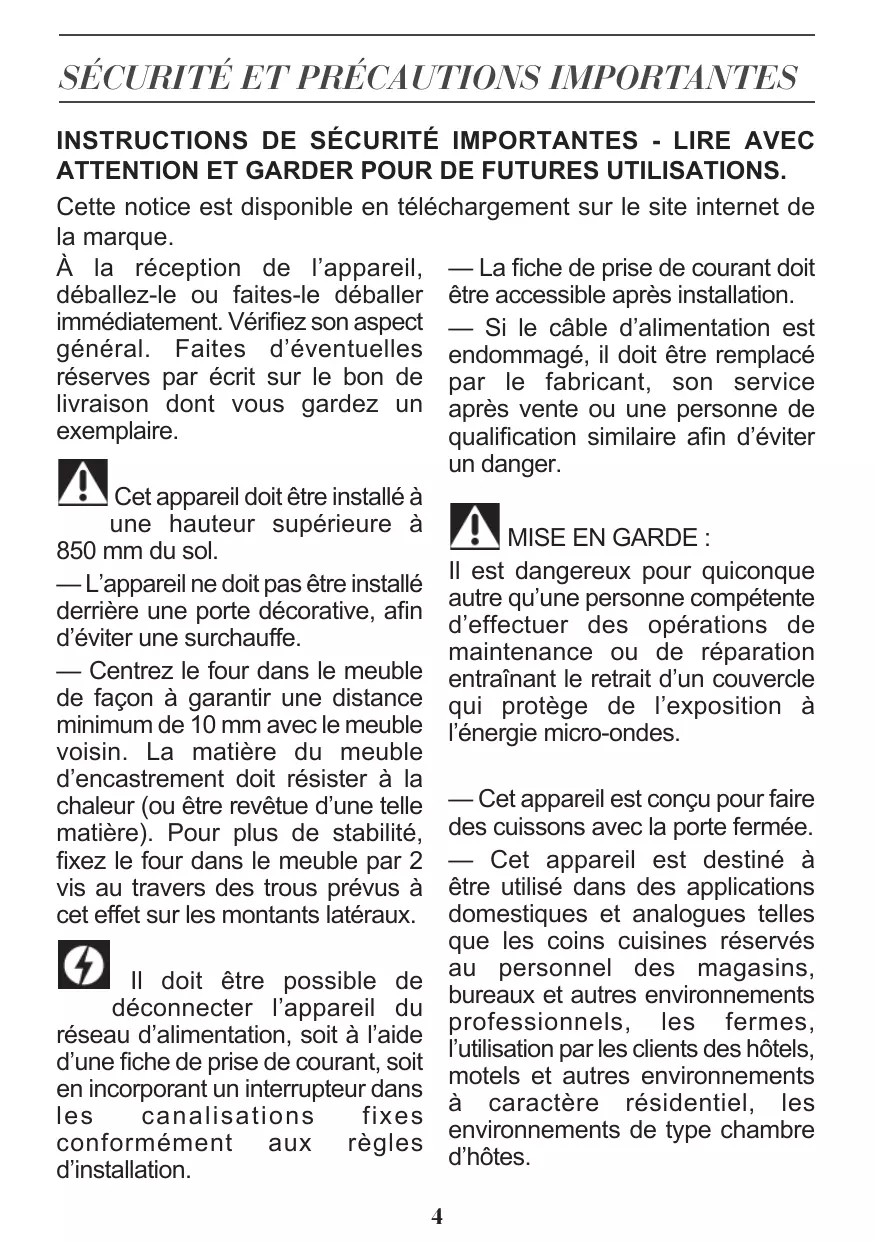 INSTRUCTIONS DE SÉCURITÉ IMPORTANTES - LIRE AVEC ATTENTION ET GARDER POUR DE FUTURES UTILISATIONS. Cette notice est disponible en téléchargement sur le site internet de la marque. À la réception de l’appareil, — La fiche de prise de courant doit déballez-le ou faites-le déballer être accessible après installation. immédiatement. Vérifiez son aspect — Si le câble d’alimentation est général. Faites d’éventuelles endommagé, il doit être remplacé réserves par écrit sur le bon de par le fabricant, son service livraison dont vous gardez un après vente ou une personne de exemplaire. qualification similaire afin d’éviter un danger. Cet appareil doit être installé à une hauteur supérieure à MISE EN GARDE : 850 mm du sol. Il est dangereux pour quiconque — L’appareil ne doit pas être installé autre qu’une personne compétente derrière une porte décorative, afin d’effectuer des opérations de d’éviter une surchauffe. maintenance ou de réparation — Centrez le four dans le meuble entraînant le retrait d’un couvercle de façon à garantir une distance qui protège de l’exposition à minimum de 10 mm avec le meuble l’énergie micro-ondes. voisin. La matière du meuble d’encastrement doit résister à la chaleur (ou être revêtue d’une telle — Cet appareil est conçu pour faire matière). Pour plus de stabilité, des cuissons avec la porte fermée. fixez le four dans le meuble par 2 — Cet appareil est destiné à vis au travers des trous prévus à être utilisé dans des applications cet effet sur les montants latéraux. domestiques et analogues telles que les coins cuisines réservés au personnel des magasins, Il doit être possible de bureaux et autres environnements déconnecter l’appareil du professionnels, les fermes, réseau d’alimentation, soit à l’aide l’utilisation par les clients des hôtels, d’une fiche de prise de courant, soit motels et autres environnements en incorporant un interrupteur dans à caractère résidentiel, les les canalisations fixes environnements de type chambre conformément aux règles d’hôtes. d’installation.