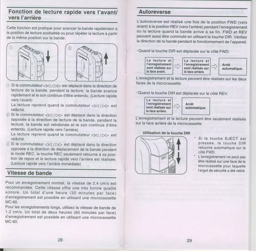 Si la touche EJECT est pressée, la touche DIR retourne automatiquement sur le côté FWD. L'enregistrement ne peut pas être réalisé sur une face de la microcassette pour laquelle l'ergot de sécurité a été retiré.