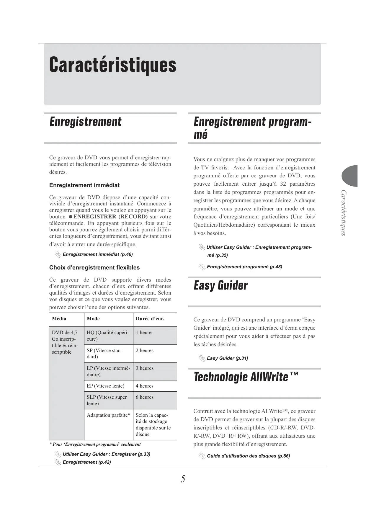 Ce graveur de DVD supporte divers modes d’enregistrement, chacun d’eux offrant différentes qualités d’images et durées d’enregistrement. Selon vos disques et ce que vous voulez enregistrer, vous pouvez choisir l’une des options suivantes. Média Mode Durée d’enr. DVD de 4,7 Go inscriptible & réinscriptible HQ (Qualité supériHXUH 1 heure SP (Vitesse stanGDUG 2 heures LP (Vitesse interméGLDLUH 3 heures (3 9LWHVVHOHQWH 4 heures SLP (Vitesse super OHQWH 6 heures Adaptation parfaite* Selon la capacité de stockage disponible sur le disque Easy Guider Ce graveur de DVD comprend un programme ‘Easy Guider’ intégré, qui est une interface d’écran conçue spécialement pour vous aider à effectuer pas à pas les tâches désirées. Easy Guider (p.31) Technologie AllWrite™ Contruit avec la technologie AllWrite™, ce graveur de DVD permet de graver sur la plupart des disques inscriptibles et réinscriptibles (CD-R/-RW, DVD55:'9'55: RIIUDQWDX[XWLOLVDWHXUVXQH SOXVJUDQGHÀH[LELOLWpG¶HQUHJLVWUHPHQW