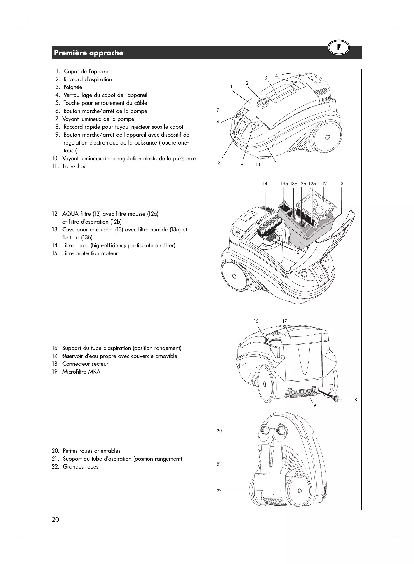 | Aspiration de matières sèches | • Moquettes, tapis et sols durs | Suceur pour moquettes | Cune pour eau usée (13) avec filtrer humide (13a) et AQUA-filtre compl. (12) + Filtre HEPA (14) + Filtre protection moteur (15) + 1 litre d'eau |