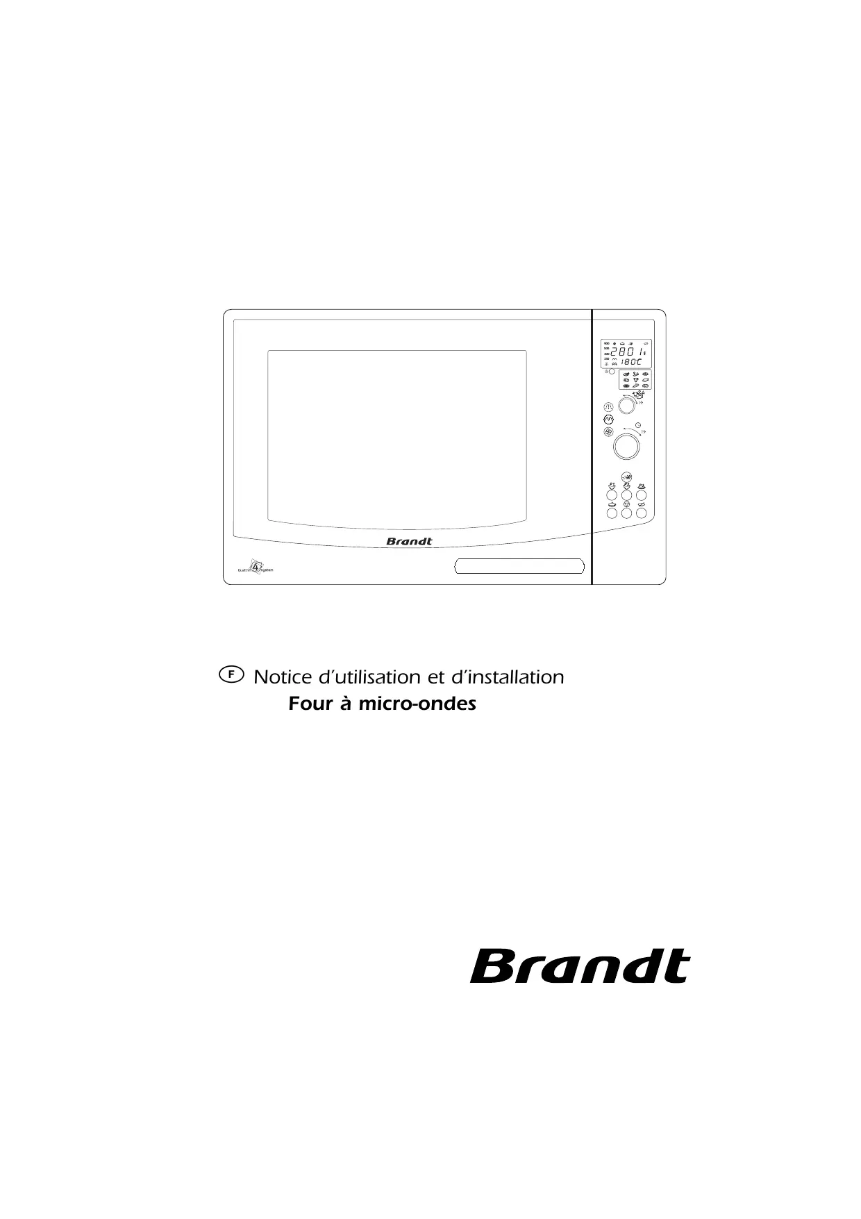 Notice d’utilisation et d’installation Four à micro-ondes Chère Madame, Cher Monsieur, Vous venez d’acquérir un Four à Micro-ondes Brandt et nous vous remercions de nous avoir choisis. Tous nos fours à micro-ondes sont conçus pour vivre avec vous de nombreuses années. Tous bénéficient de la même exigence et de la même qualité qui ont fait la réputation de Brandt, première marque française d’électroménager. Nous vous remercions de votre confiance. Votre satisfaction sera notre récompense. La Marque Brandt Instructions de sécurité importantes. Lire avec attention et garder pour les futures utilisations. SOMMAIRE Installation Principes de fonctionnement ... Mises en garde ... Présentation ... Bandeau de Commande ... Mise à l’heure ... Equivalence des fonctions ... Les afficheurs & les sélecteurs ... Les accessoires ... Programmation ... Programmation Micro-ondes ... Programme automatique de cuisson Conseils de cuisson automatique Décongélation ... "Speed DEFROST" Tableaux de décongélation ... La fonction Gril ... La fonction Micro-ondes + Gril ... Les fonctions chaleur tournante ... Programmation chaleur tournante ... Programmation chaleur tournante + micro-ondes Essais de cuisson type Touches mémoires P1/P2/P3 ... Recommandations ... Entretien / Nettoyage ... Un petit problème ! Que faire ? ... Service Après-Vente ...