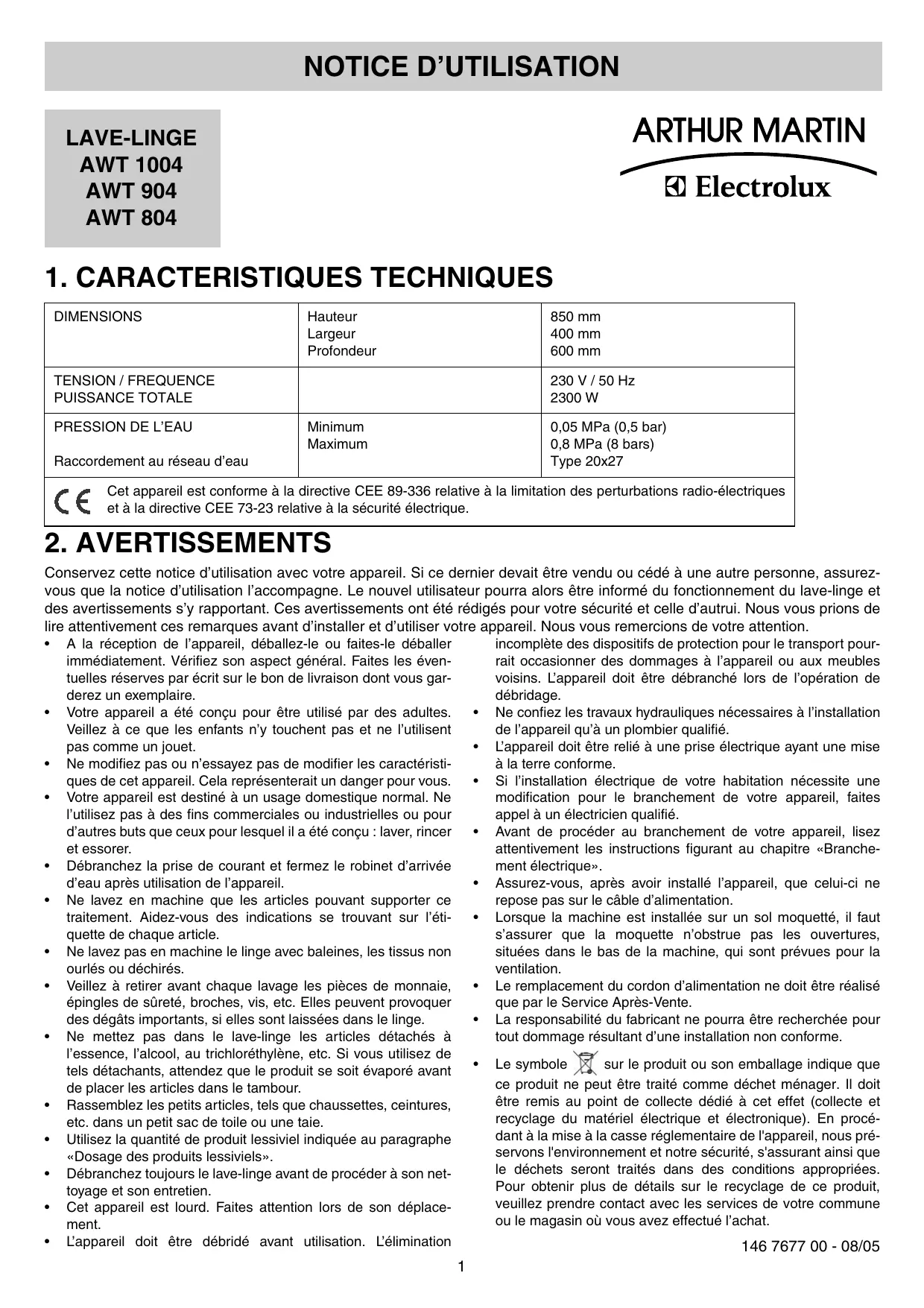 Retrouvez gratuitement la notice de l'appareil AWT1004 ARTHUR MARTIN au format PDF.