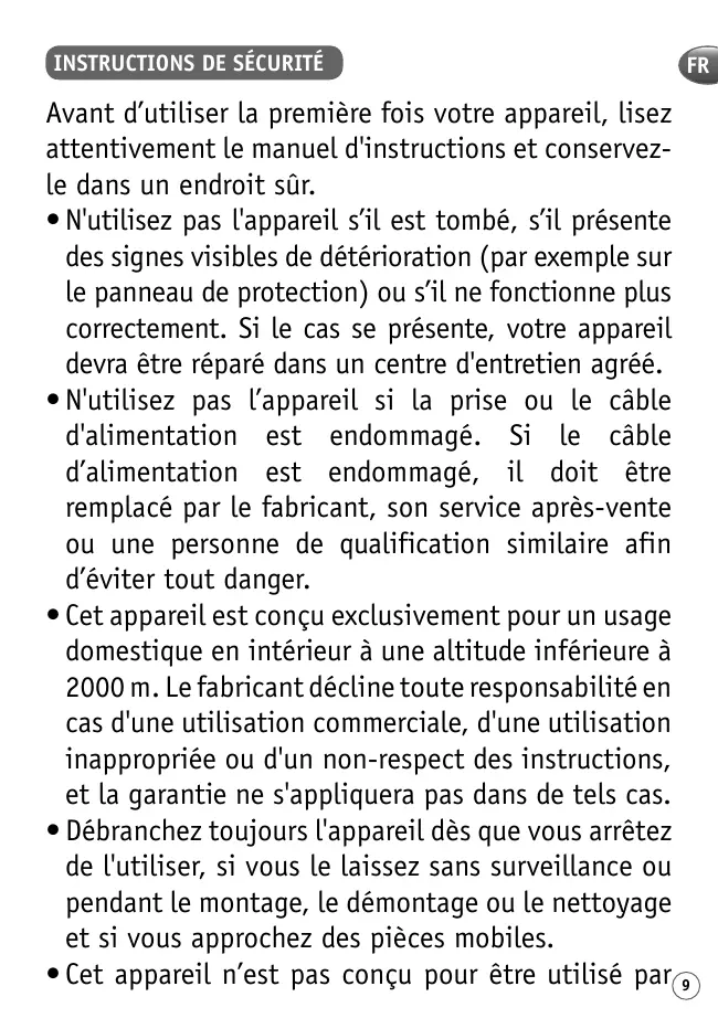 • Cet appareil est conçu exclusivement pour un usage domestique en intérieur à une altitude inférieure à 2000 m. Le fabricant décline toute responsabilité en cas d'une utilisation commerciale, d'une utilisation inappropriée ou d'un non-respect des instructions, et la garantie ne s'appliquera pas dans de tels cas.