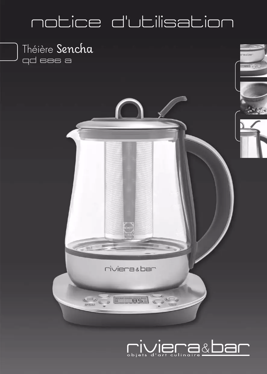 - les pièces d’usure. - les pièces amovibles ou mobiles endommagées suite à une mauvaise manipulation, une chute ou un choc lors de leur manipulation, tels que les couvercles, le panier à thé, la verseuse. - les appareils utilisés autrement qu’en fonctionnement normal dans la sphère privée. Le fabricant ne pourra être tenu responsable des dommages éventuels causés par un usage incorrect de l’appareil, non conforme au mode d’emploi ou par des réparations effectuées par un personnel non qualifié. Les réparations doivent être uniquement effectuées dans un des Centres Services Agréés de la marque. Pour tout renseignement, contacter le Service Relations Clientèles de Riviera & Bar au 03.88.18.66.18 ou visiter le site internet www.riviera-et-bar.fr. Les pièces d’usure et dommages exclus de la garantie sont remplacées ou réparés contre remboursement des frais. La durée de la garantie débute à partir de la date d’achat d’origine. Il peut y être fait recours uniquement avec la présentation de l’appareil défectueux accompagné de la facture ou preuve d’achat. Conformément à l’article L111-2 du code de la consommation, la disponibilité des pièces de rechange, prévues pour un produit réparable est de 5 ans à partir de sa date de fabrication (information mentionnée sur le produit : numéro de lot ou de série). Rappel : pour toute intervention, il vous sera demandé de retourner le produit sous son conditionnement initial afin d’éviter tout dommage supplémentaire lié au transport. Nous vous invitons donc à conserver l’emballage d’origine dans son intégralité.