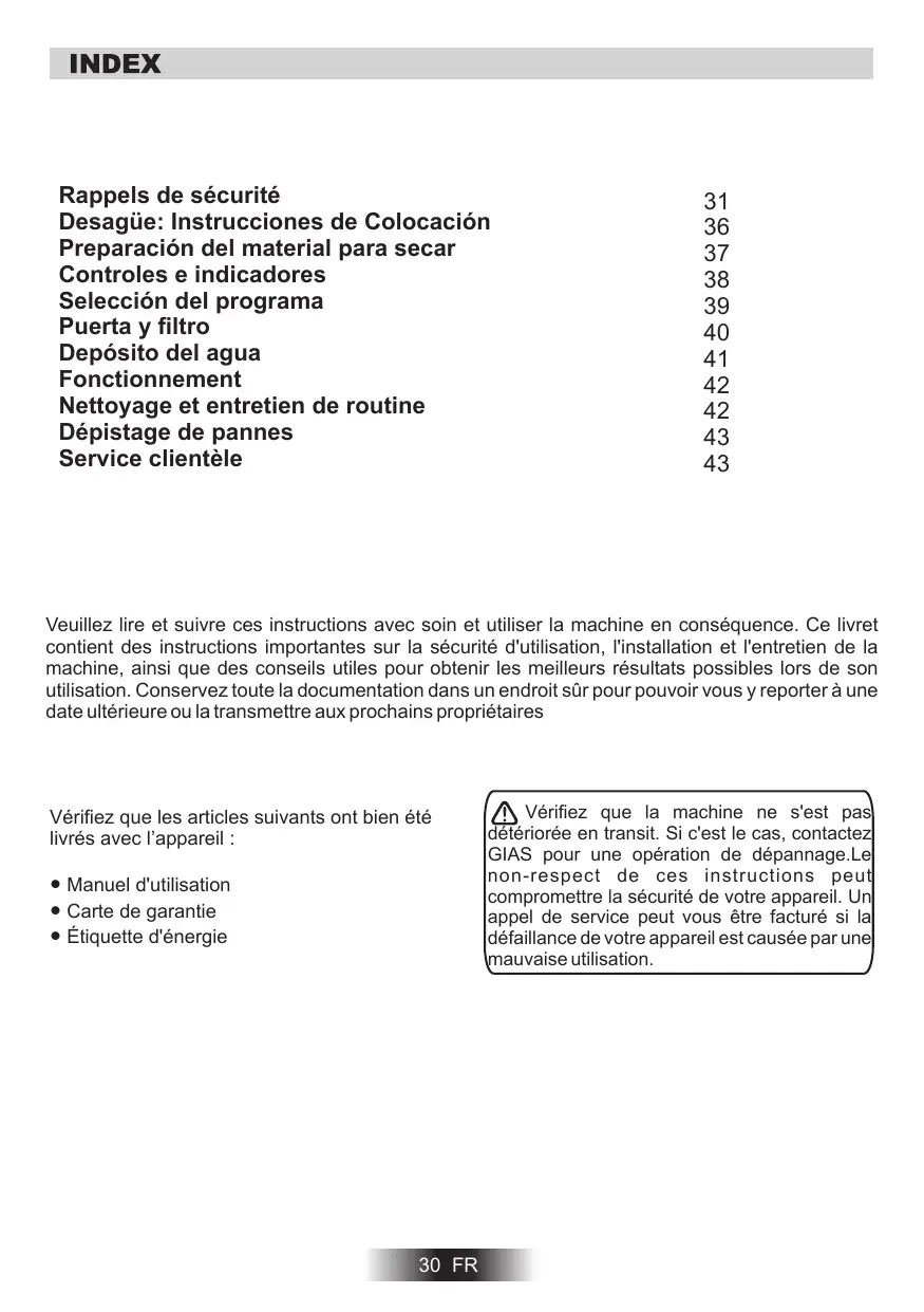 Veuillez lire et suivre ces instructions avec soin et utiliser la machine en conséquence. Ce livret contient des instructions importantes sur la sécurité d'utilisation, l'installation et l'entretien de la machine, ainsi que des conseils utiles pour obtenir les meilleurs résultats possibles lors de son utilisation. Conservez toute la documentation dans un endroit sûr pour pouvoir vous y reporter à une date ultérieure ou la transmettre aux prochains propriétaires Vérifiez que les articles suivants ont bien été livrés avec l’appareil : ● Manuel d'utilisation ● Carte de garantie ● Étiquette d'énergie 30 FR Vérifiez que la machine ne s'est pas détériorée en transit. Si c'est le cas, contactez GIAS pour une opération de dépannage.Le non-respect de ces instructions peut compromettre la sécurité de votre appareil. Un appel de service peut vous être facturé si la défaillance de votre appareil est causée par une mauvaise utilisation.