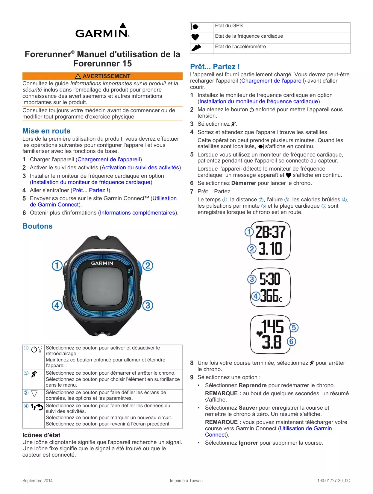 Forerunner 15 AVERTISSEMENT Consultez le guide Informations importantes sur le produit et la sécurité inclus dans l'emballage du produit pour prendre connaissance des avertissements et autres informations importantes sur le produit. Consultez toujours votre médecin avant de commencer ou de modifier tout programme d'exercice physique.