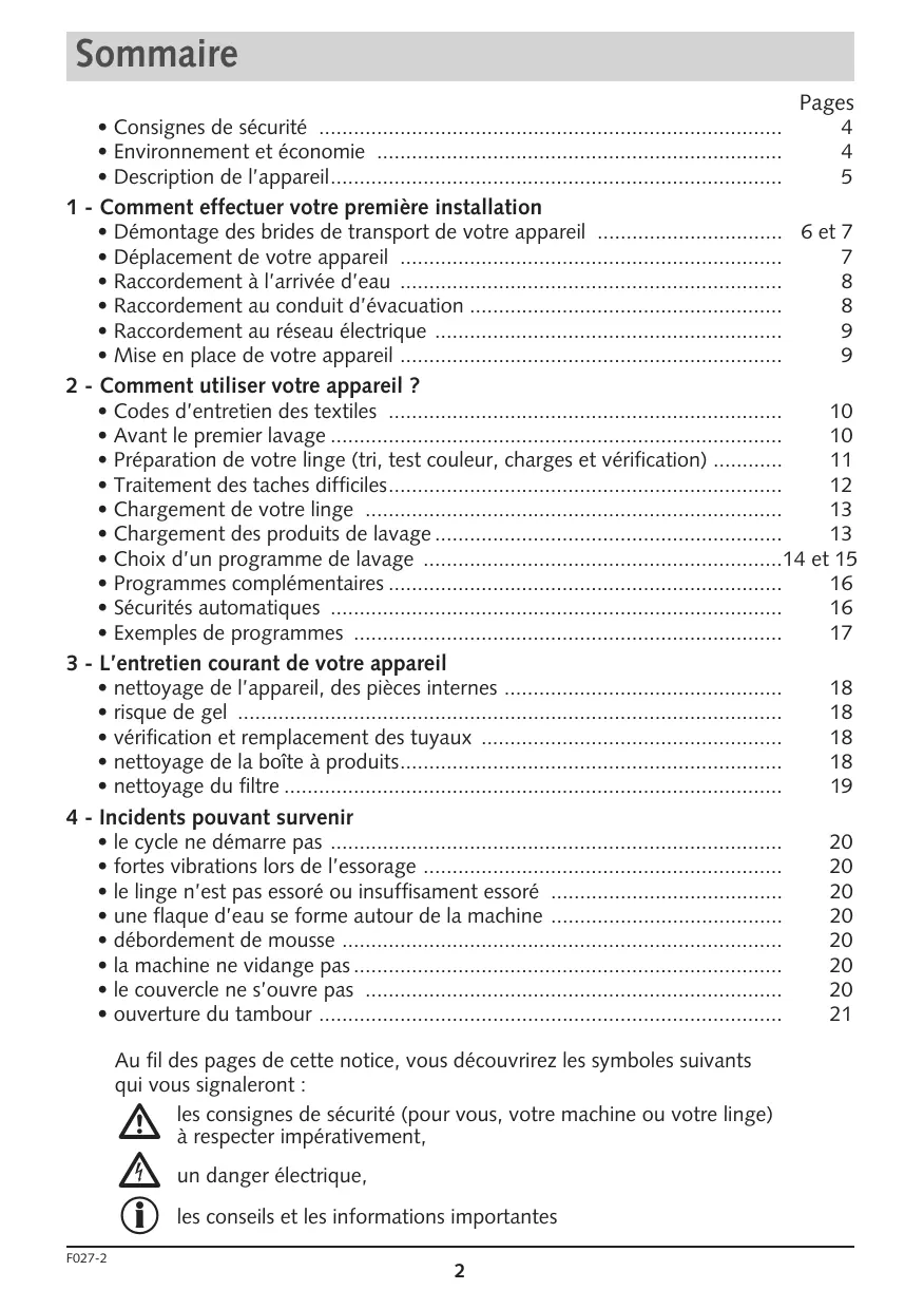 - ouverture du tambour ................................................................................ Au fil des pages de cette notice, vous découvrirez les symboles suivants qui vous signaleront : les consignes de sécurité (pour vous, votre machine ou votre linge) à respecter impérativement,