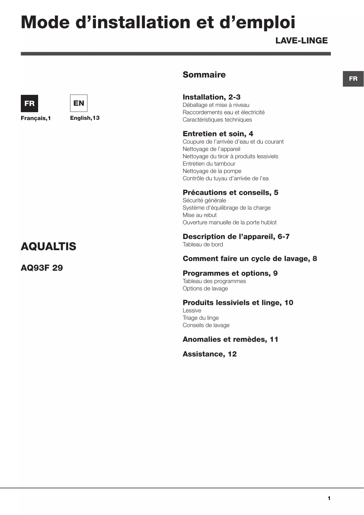 AQ93F29FR - Machine à laver HOTPOINT - Notice d'utilisation et mode d'emploi gratuit
