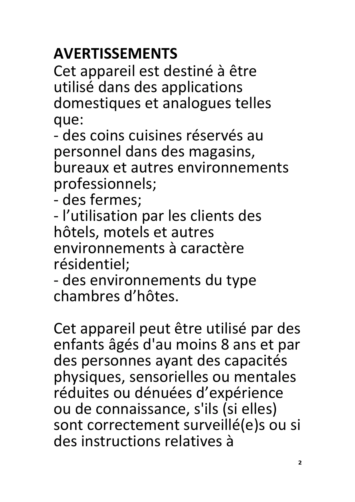 ‐ des environnements du type chambres d’hôtes. Cet appareil peut être utilisé par des enfants âgés d'au moins 8 ans et par des personnes ayant des capacités physiques, sensorielles ou mentales réduites ou dénuées d’expérience ou de connaissance, s'ils (si elles) sont correctement surveillé(e)s ou si des instructions relatives à 2
