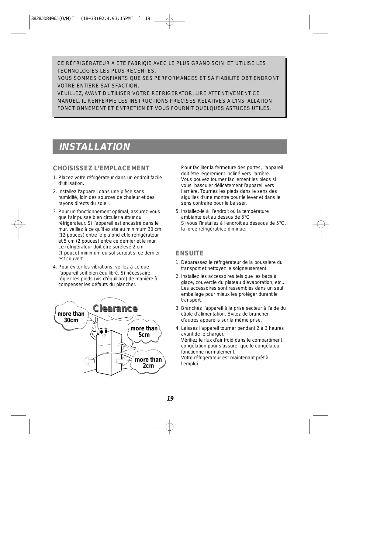 - Pour un fonctionnement optimal, assurez-vous que l'air puisse bien circuler autour du réfrigérateur. Si l'appareil est encastré dans le mur, voirlez à ce qu'il existe au minimum 30 cm (12 pouces) entre le plafond et le réfrigérateur et 5 cm (2 pouces) entre ce dernier et le mur. Le réfrigérateur doit être surélevé 2 cm (1 pouce) minimum du sol surtout si ce dernier est couvert.