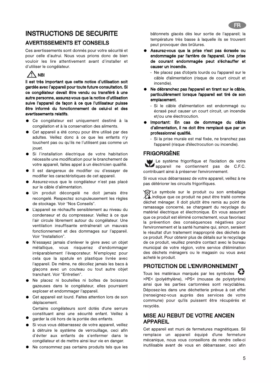 Assurez-vous que le congealateur n'est pas placé sur le cable d'alimentation. - Un produit decongegé ne doit jamais être recongepé. Respecté scrupuleusement les régles de stockage. Voir "Nos Consels".