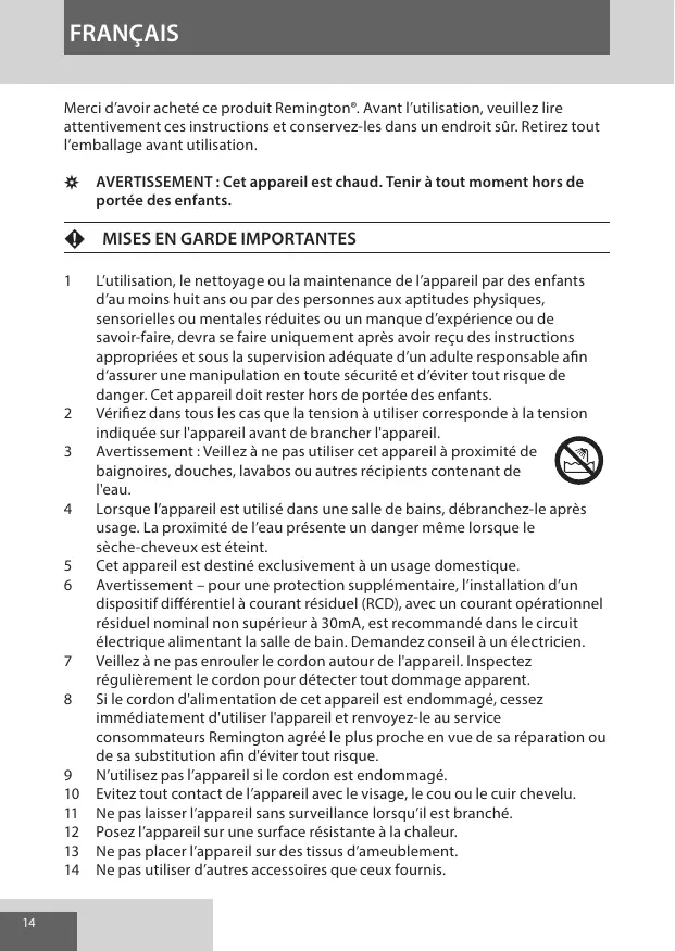 Merci d'avoir acheté ce produit Remington*. Avant l'utilisation, veuillez lui attentivement ces instructions et conservez-les dans un endroit sûr. Retirez tout l'emballage avant utilisation.