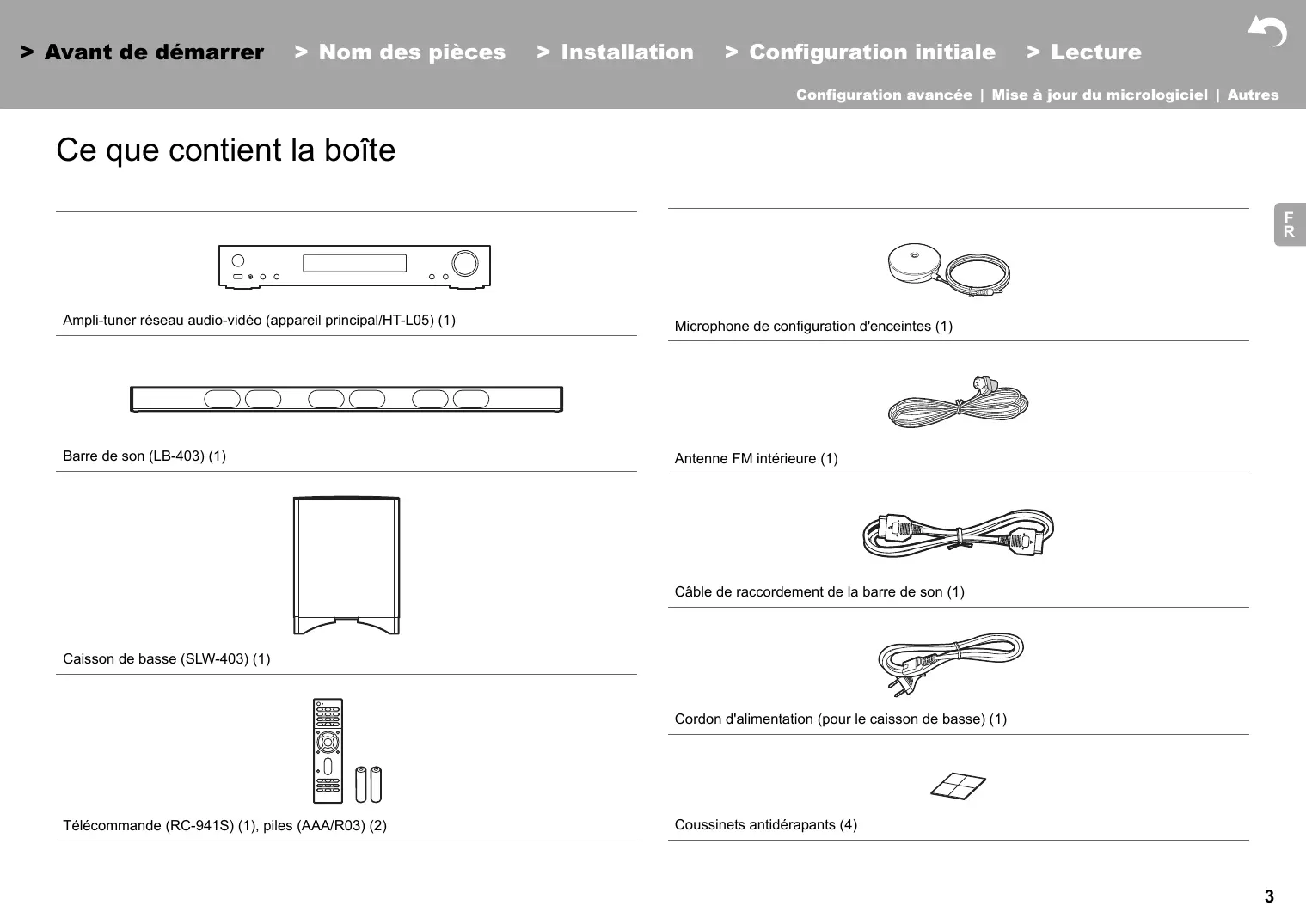 Ampli-tuner réseau audio-vidéo (appareil principal/HT-L05) (1) Microphone de configuration d'enceintes (1) Barre de son (LB-403) (1) Antenne FM intérieure (1) Câble de raccordement de la barre de son (1) Caisson de basse (SLW-403) (1) Cordon d'alimentation (pour le caisson de basse) (1) Télécommande (RC-941S) (1), piles (AAA/R03) (2) Coussinets antidérapants (4)