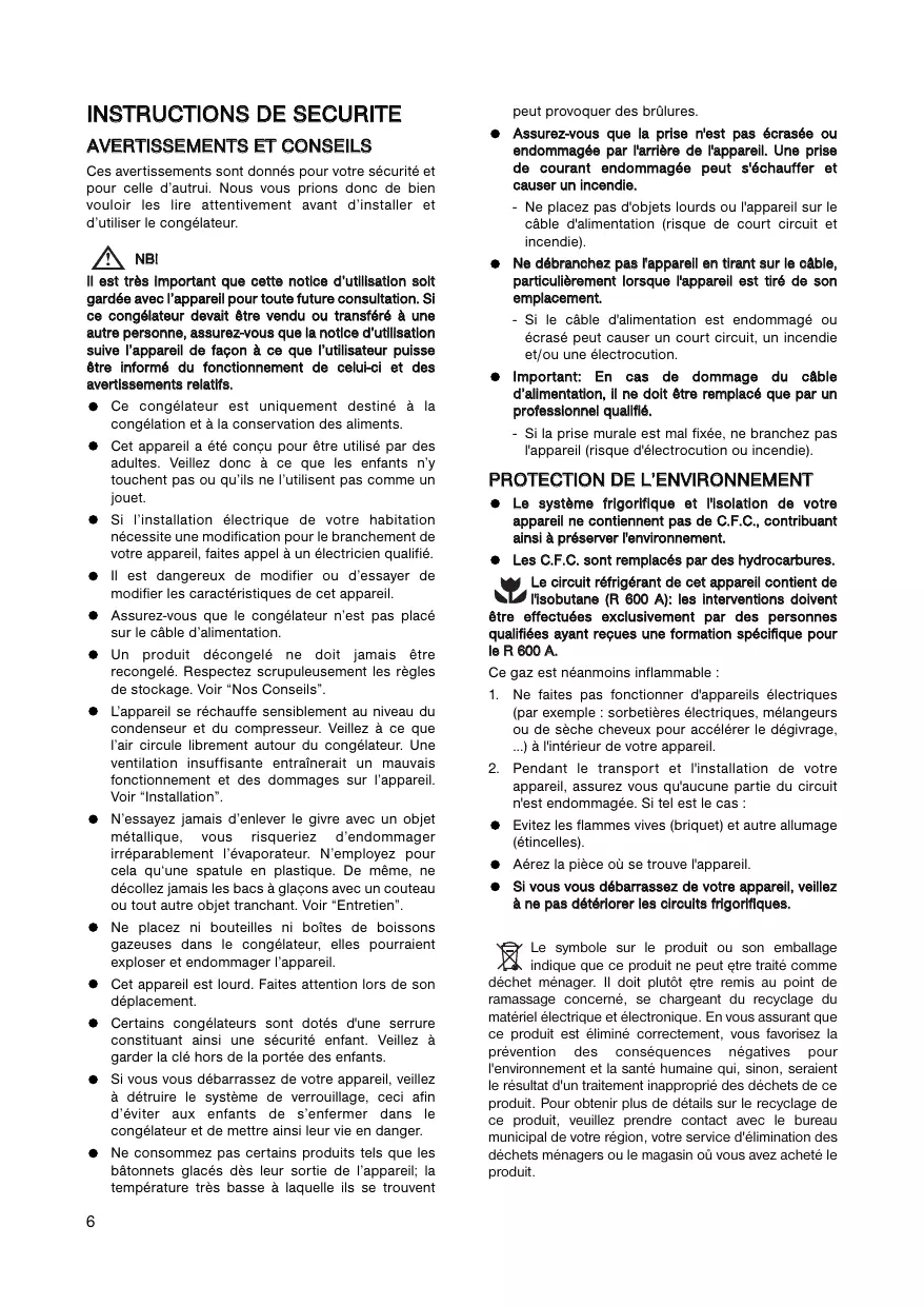 Ces avertissements sont disponibles pour votre sécurité et pour cette d'autrui. Nous vous prions donc de bien fouvoir les dire attentivement avant d'instructor et d'utiliser le congelateur.